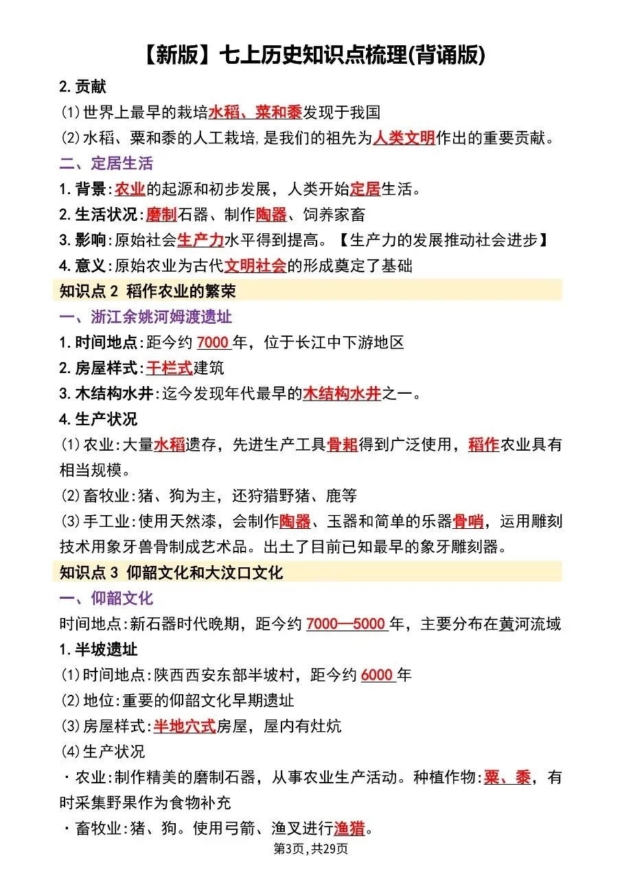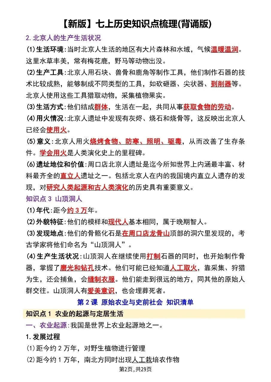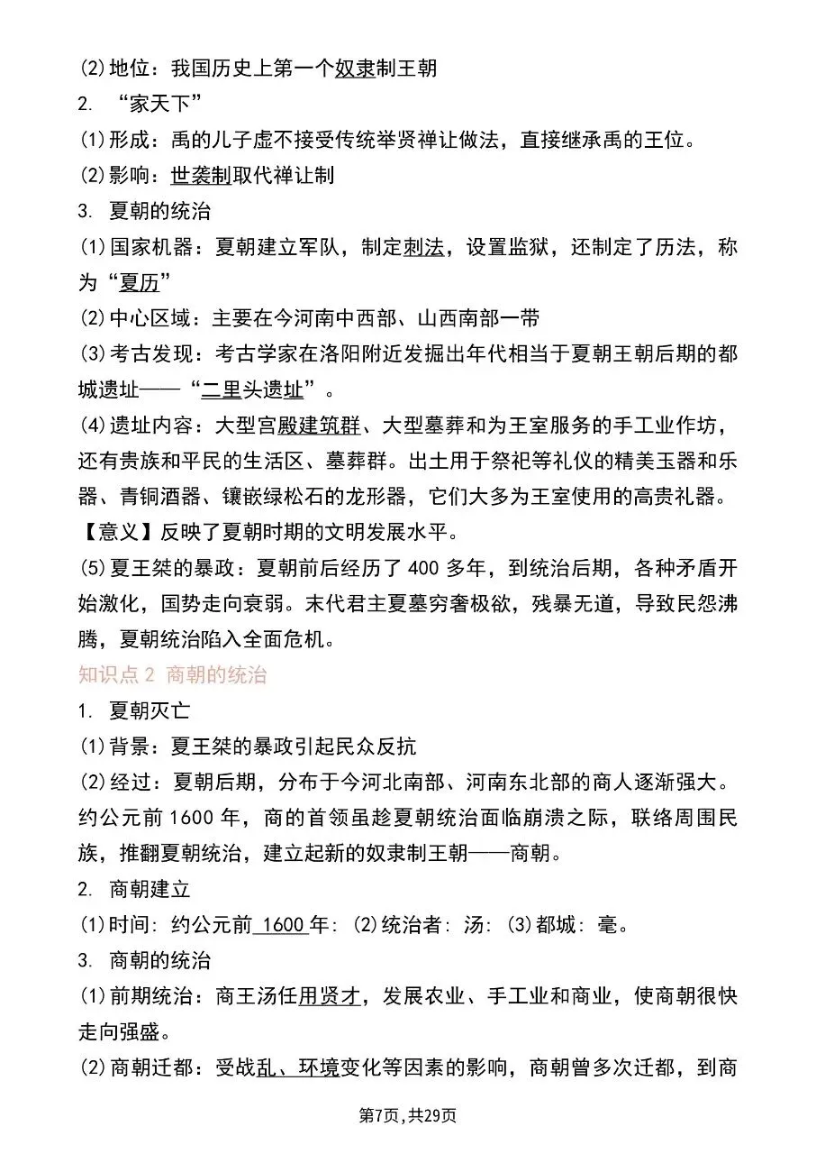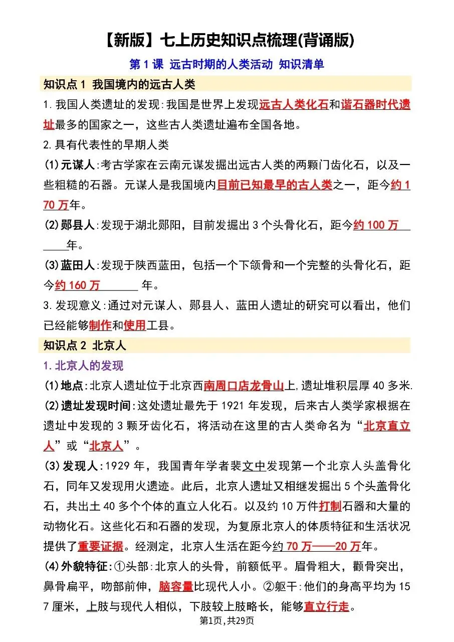 【七上历史】七年级初一上册历史期末复习重点知识点总结背诵