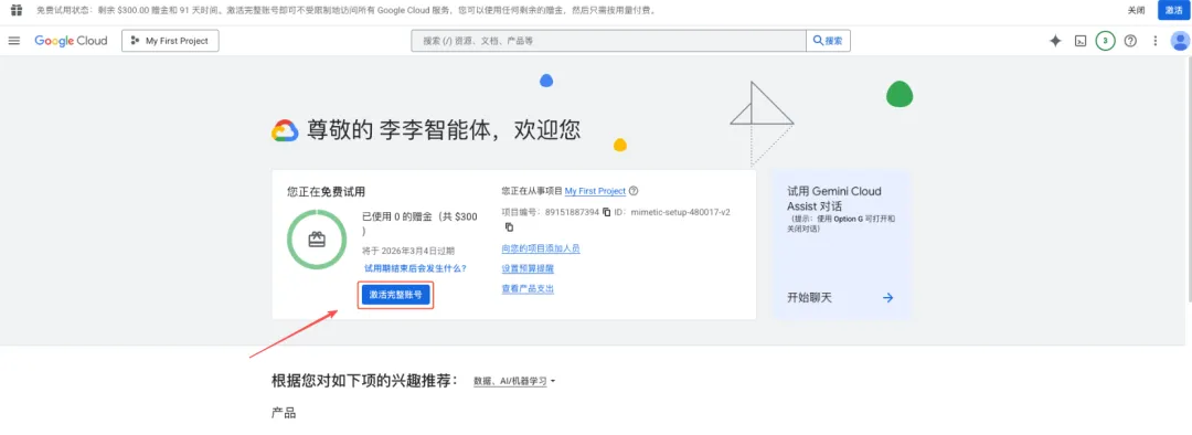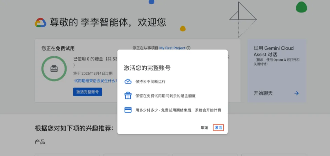 完成账号配置后,进入控制台:https://console.cloud.google.com/,激活账号。