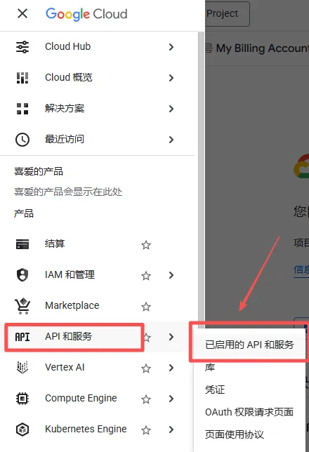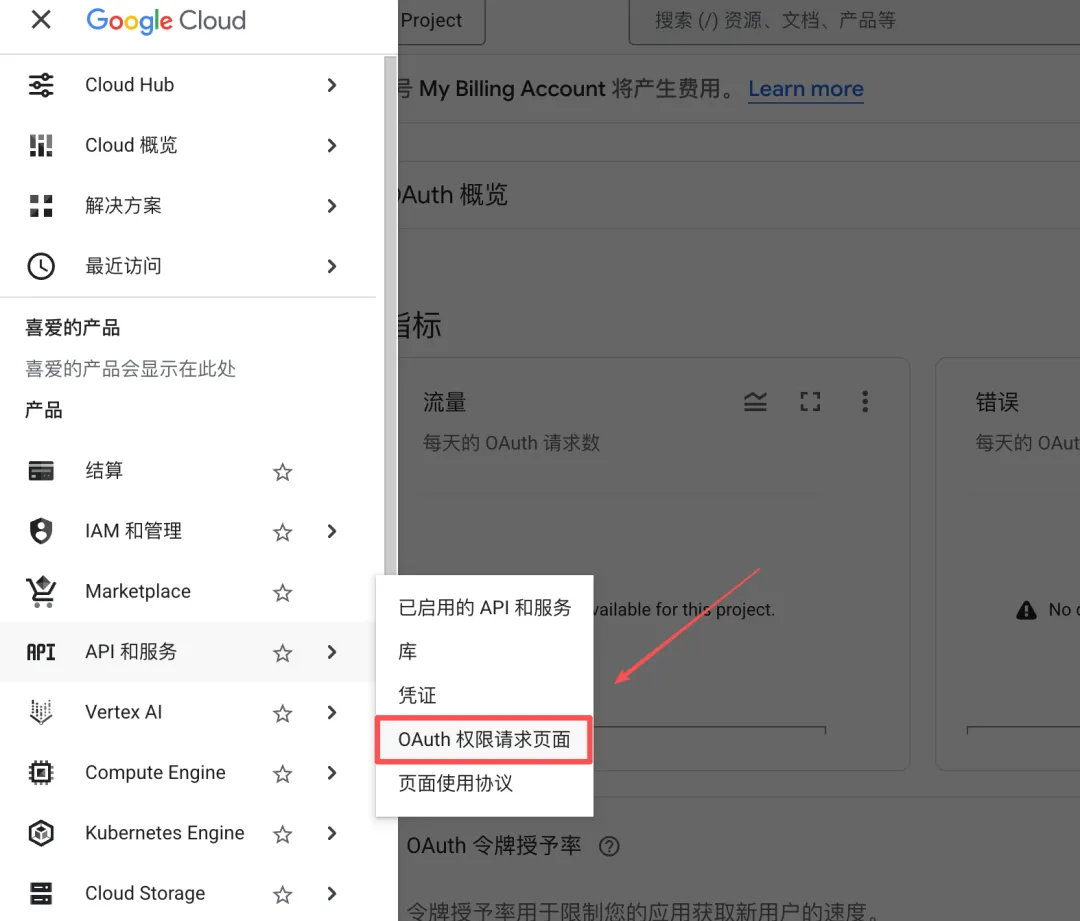 点击左上角,在「API 和服务」点击“OAuth 权限请求页面”。