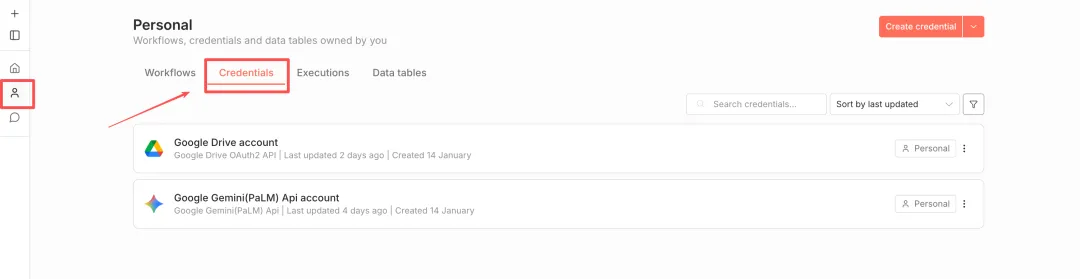 进入 N8N,点击左侧边框的「Personal」,选择“Credentials”。