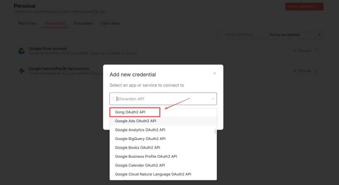 点击“Create credential”,在下拉框中选择“Google OAuth2 API”