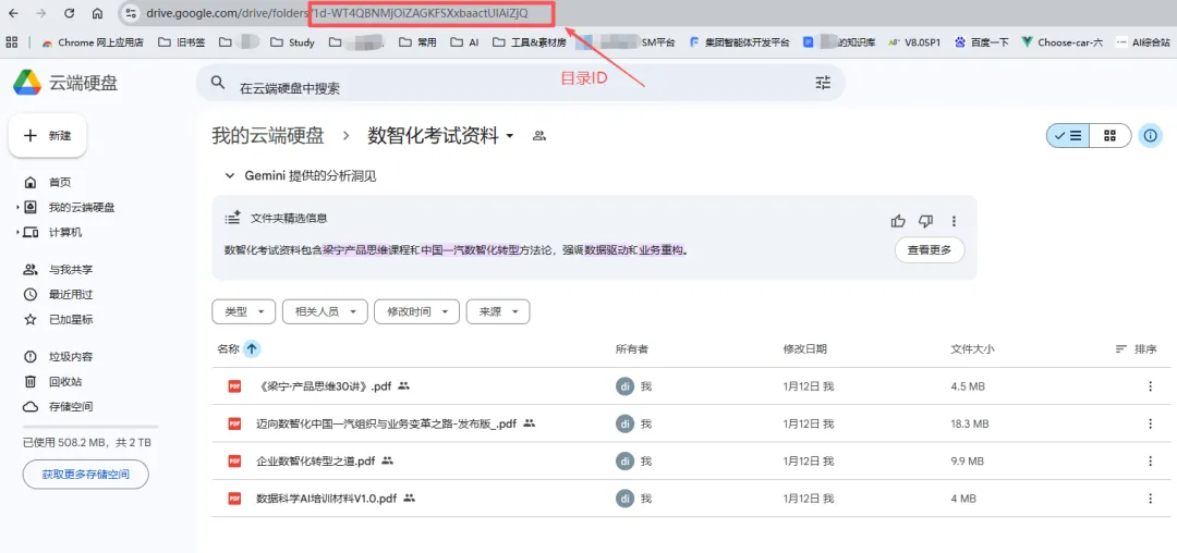 浏览器打开Google Drive: https://drive.google.com/drive/home,新建一个目录,将需要分析的材料(PDF)上传到文件夹中。