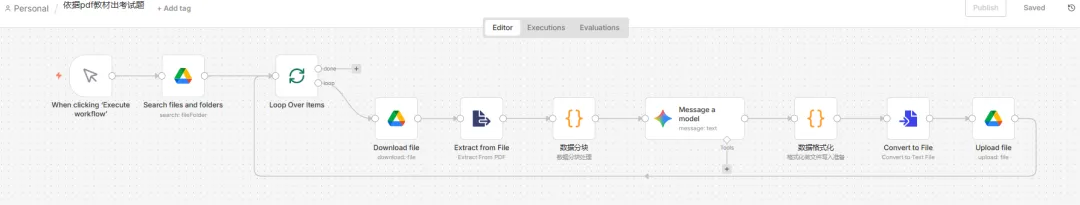 // 获取所有 Gemini 生成的结果项const items = $input.all();// 初始化一个空字符串来存放合并后的内容let combinedContent = "";let fileName = $('Loop Over Items').first().json.name;// 遍历每一个分块的结果for (const item of items) { // 1. 安全地提取 Gemini 回复的文本 // 路径对应您刚才提供的 JSON 结构: candidates[0].content.parts[0].text const generatedText = item.json.candidates?.[0]?.content?.parts?.[0]?.text;if (generatedText) { combinedContent += generatedText + "\n\n---\n\n"; // 每个分块之间加个分割线 } // 2. 尝试获取书名(只要获取一次就行)if (item.json.source_source && fileName === "未知书名") { fileName = item.json.source_source; }}// 在开头加上标题combinedContent = `# ${fileName} - 自动生成题库\n\n` + combinedContent;// 返回整理好的数据return [ { json: { fileName: `${fileName}_题库.md`, // 设置文件名,比如 "迈向数智化_题库.md" fileContent: combinedContent } }];节点八:Convert to File