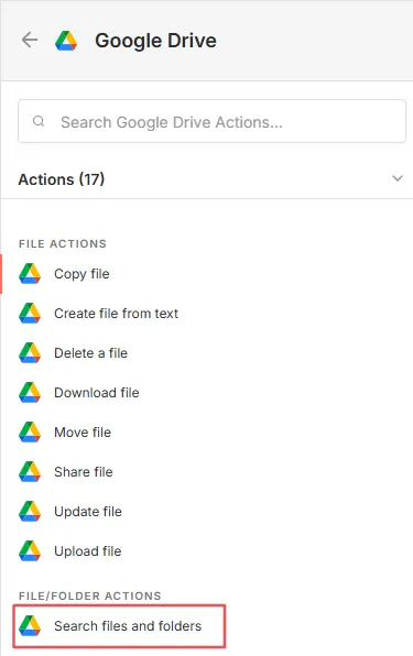 添加Google Drive节点,选择“Search files and folders”。用于列出文件夹内的文件。