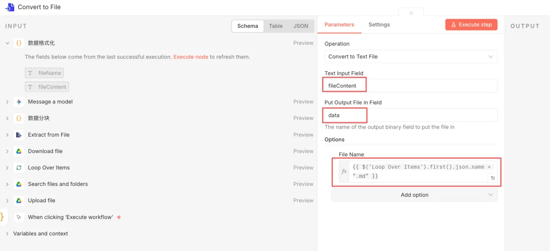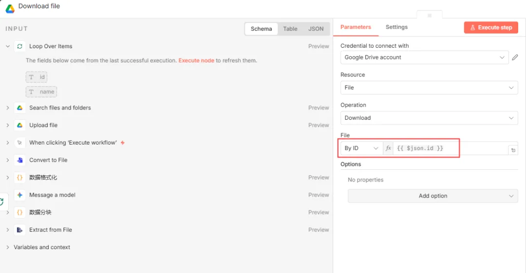 设置如下图所示。File选择“By ID”,值为“{{ $json.id }}”,即Loop节点正在循环的文件ID。