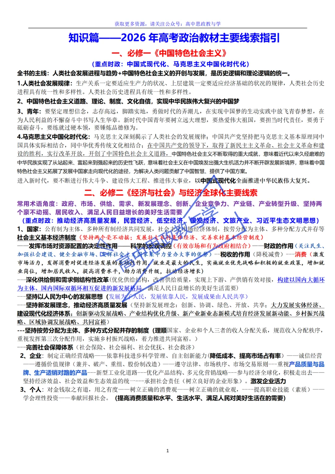 必修一 中国特色社会主义核心必备知识(课标、考情、思维导图、主干知识)2026