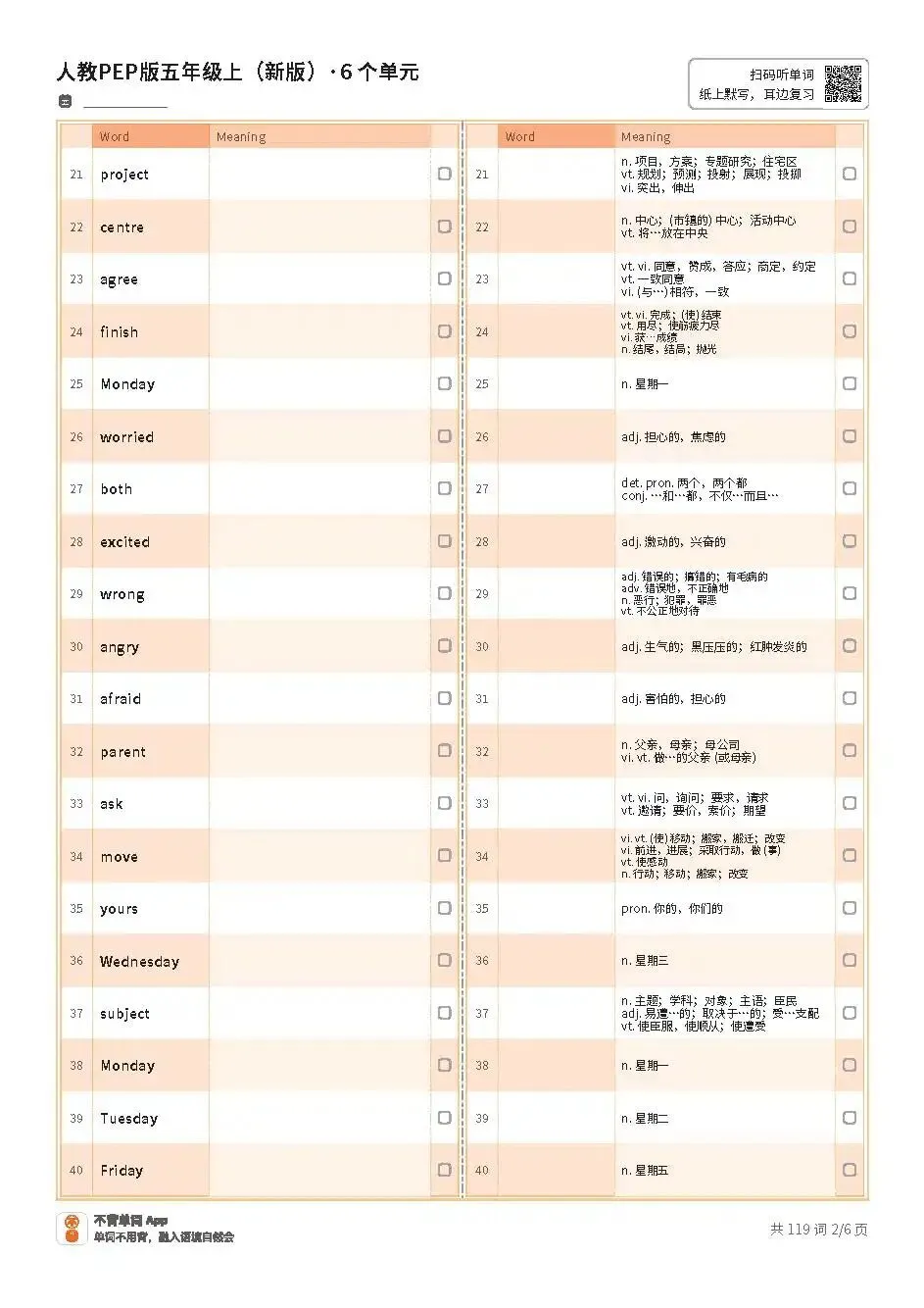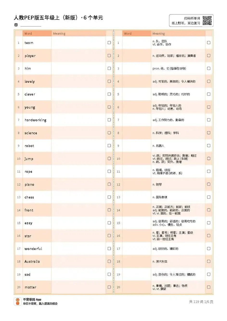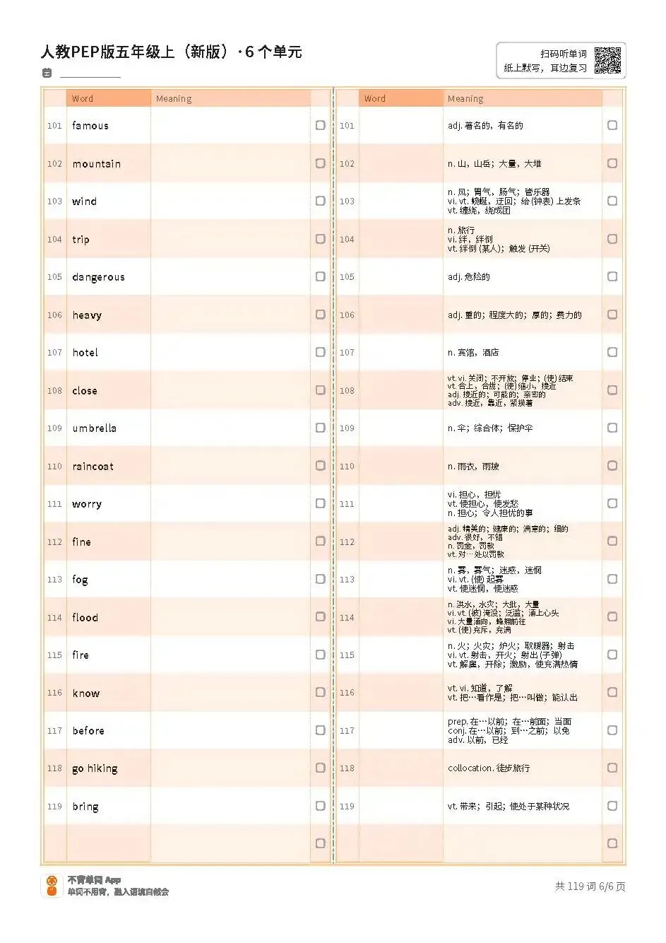 >小学期末复习 | 新人教PEP五上英语Unit1~Unit6单词表(适合打印练习,文末内附PDF免费获取方式)