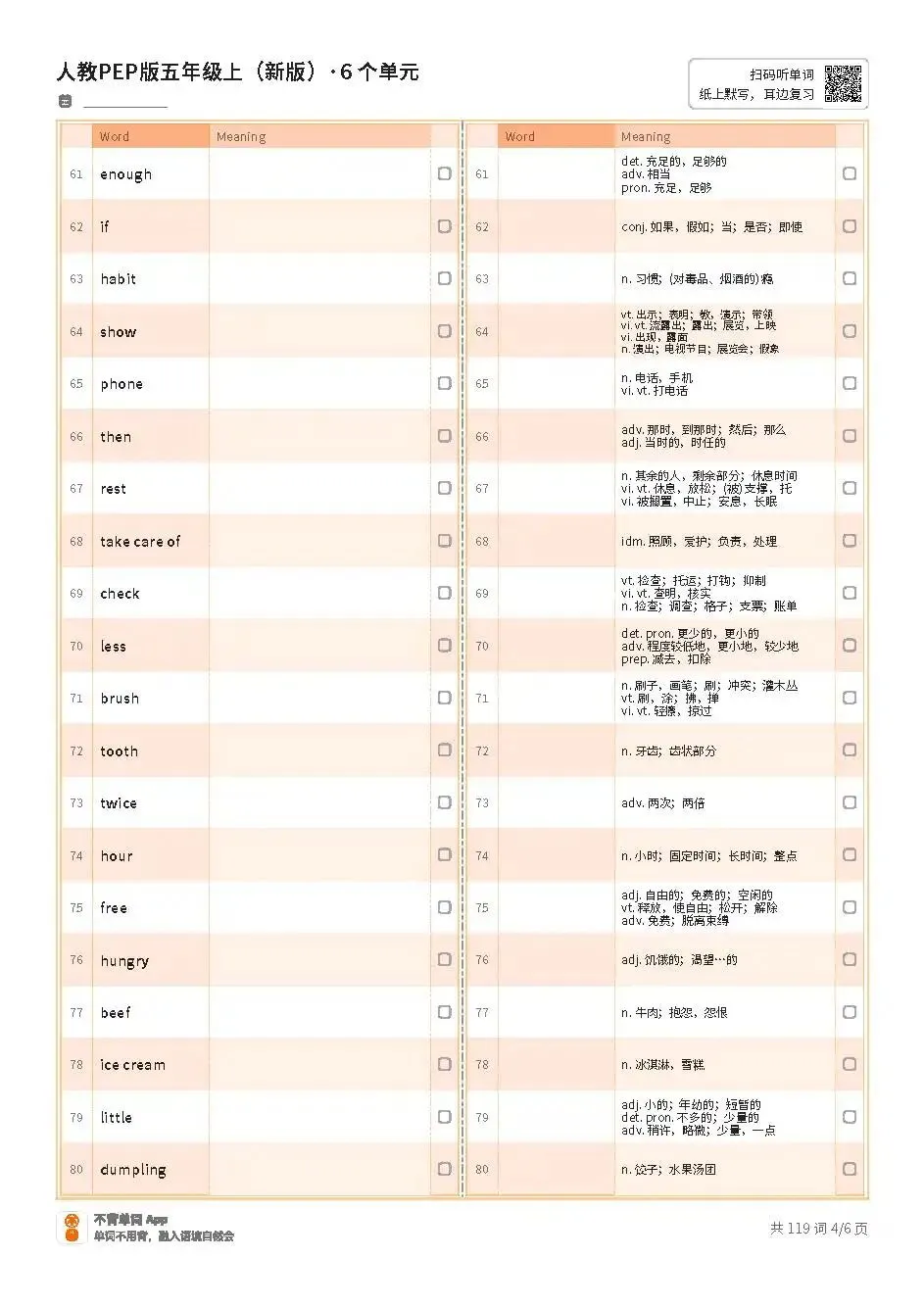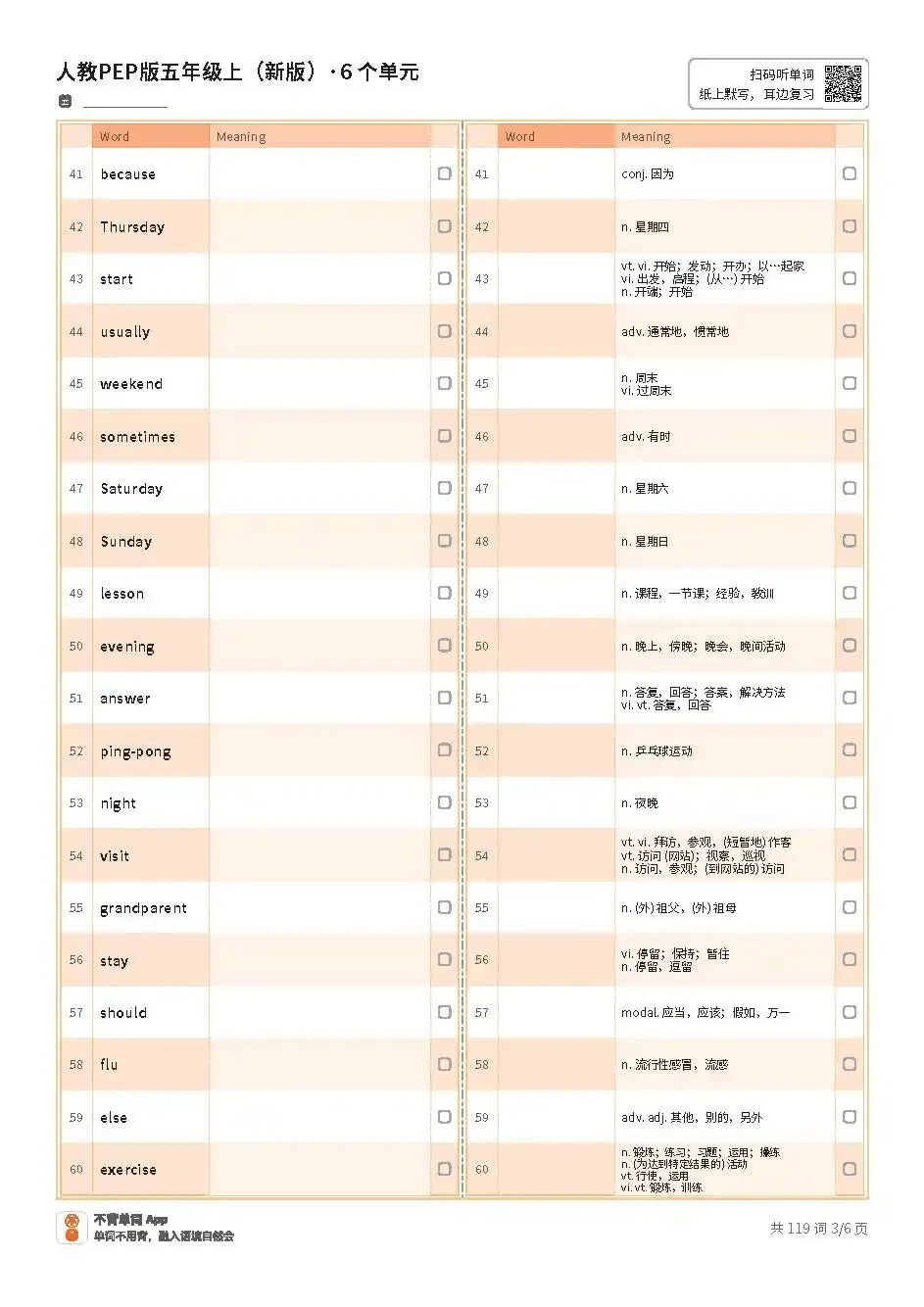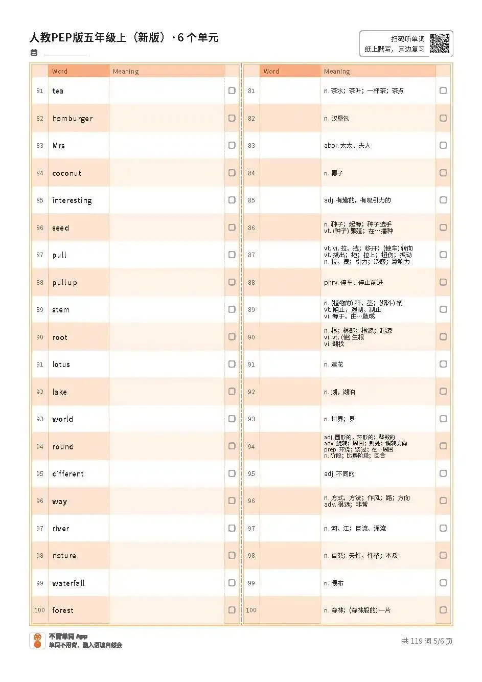 >小学期末复习 | 新人教PEP五上英语Unit1~Unit6单词表(适合打印练习,文末内附PDF免费获取方式)