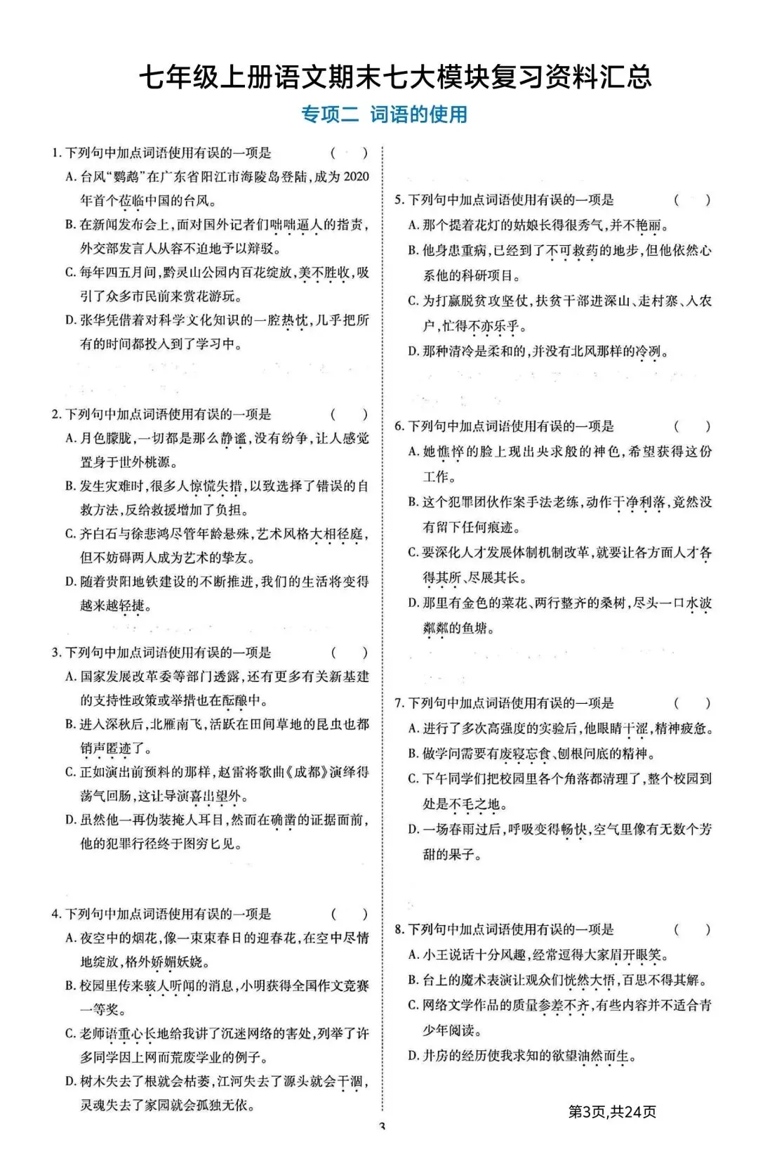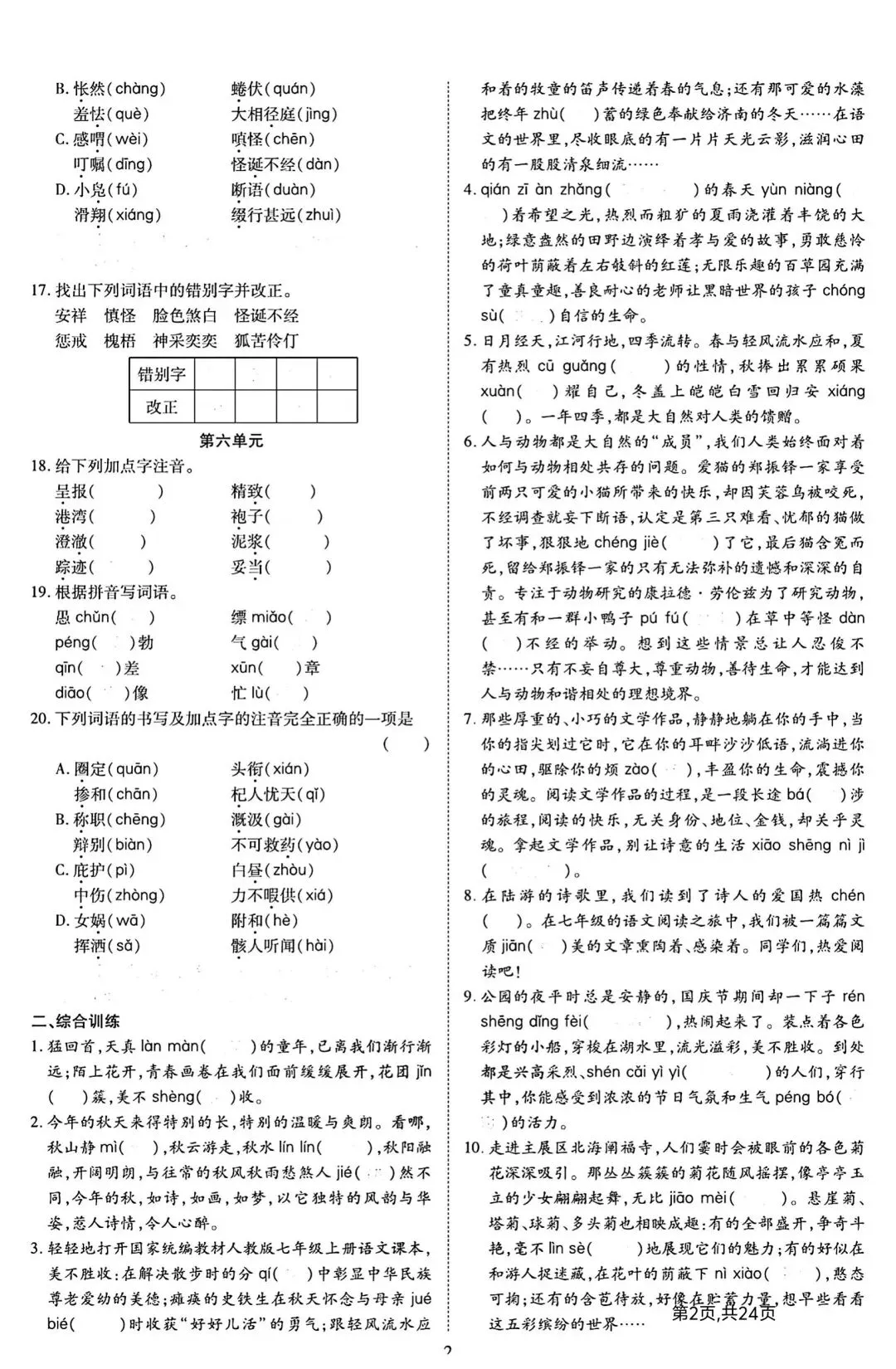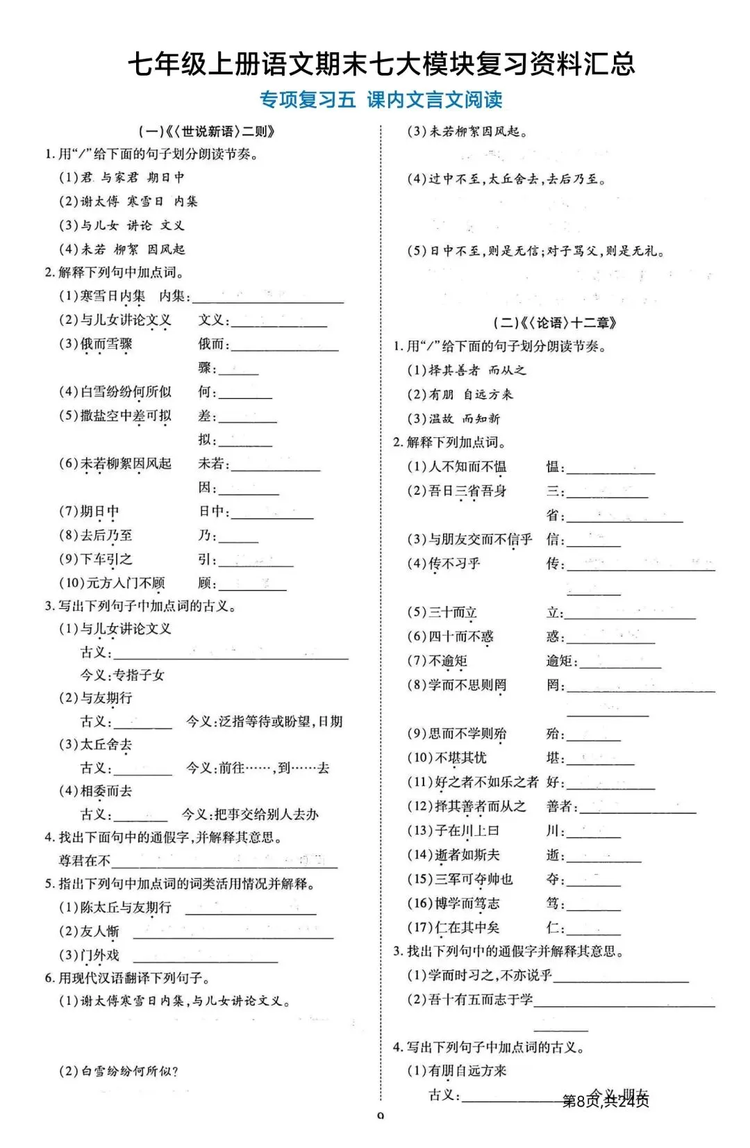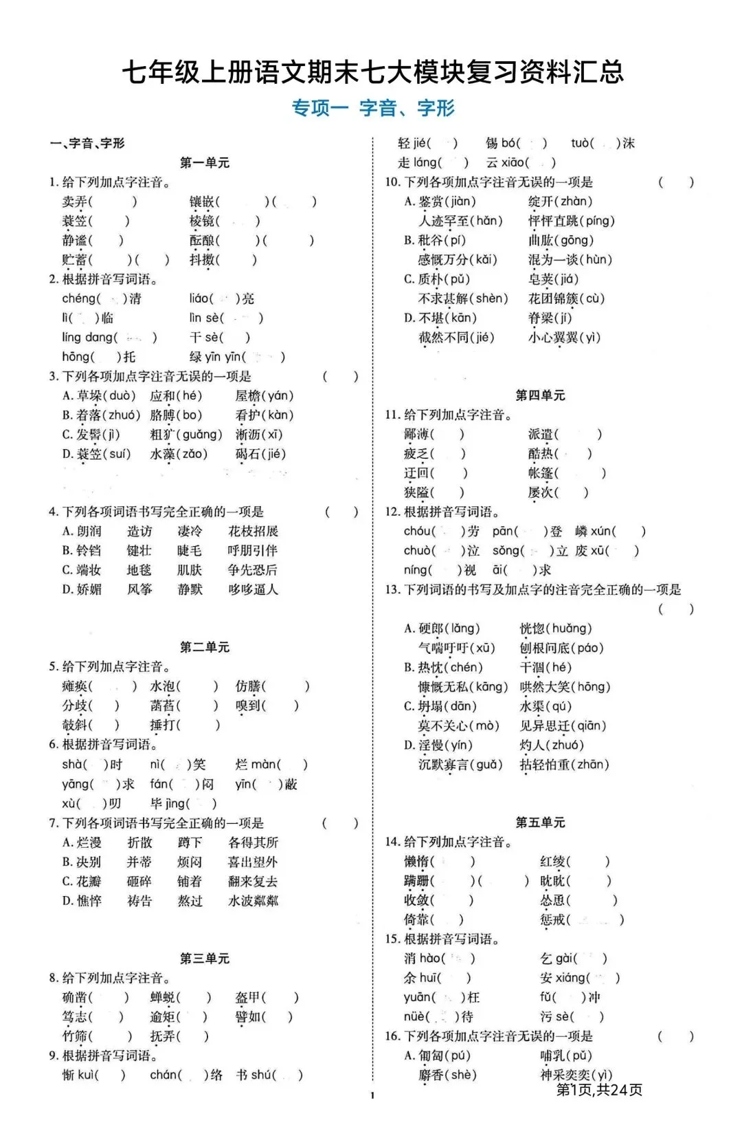 新版初一七年级上册语文期末七大模块复习资料汇总完整高清电子版可打印