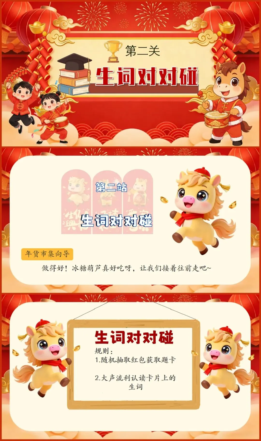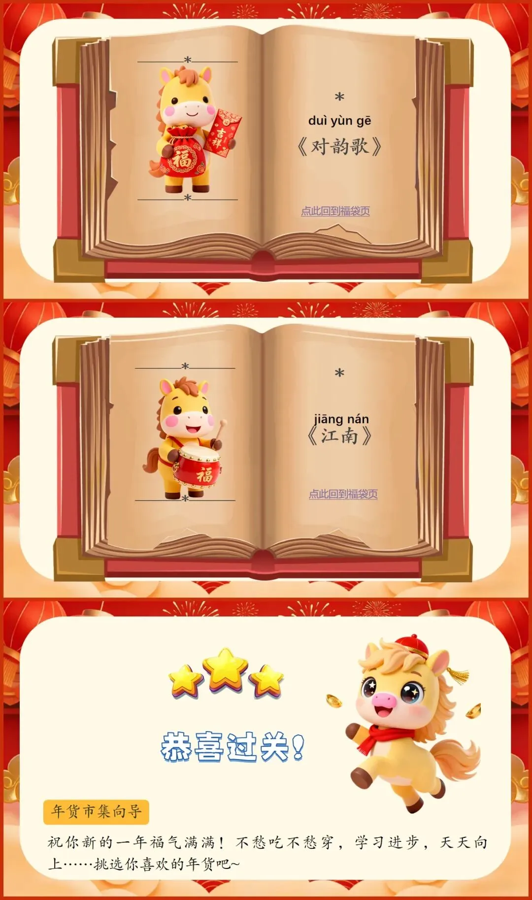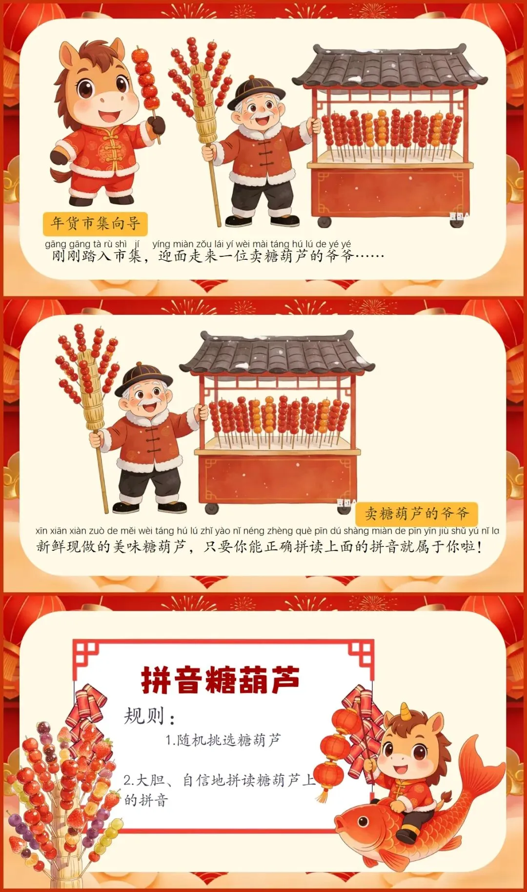 把期末考变成“年货市集闯关”,拼音糖葫芦、生词红包、诵读福袋、说话扫年货,每一关都藏着惊喜!孩子们玩着就把拼音、生字、古诗、看图说话全练了,快乐和知识点双丰收,这才是期末该有的样子~