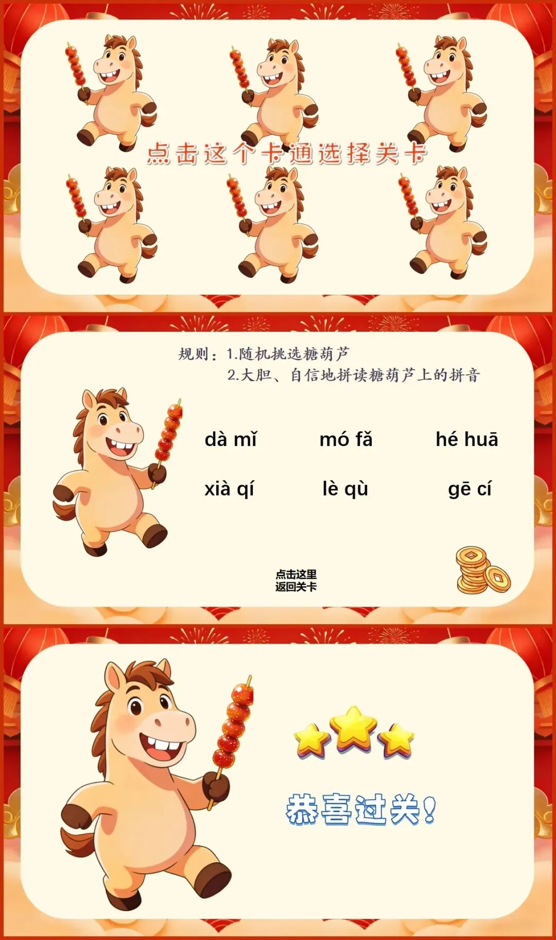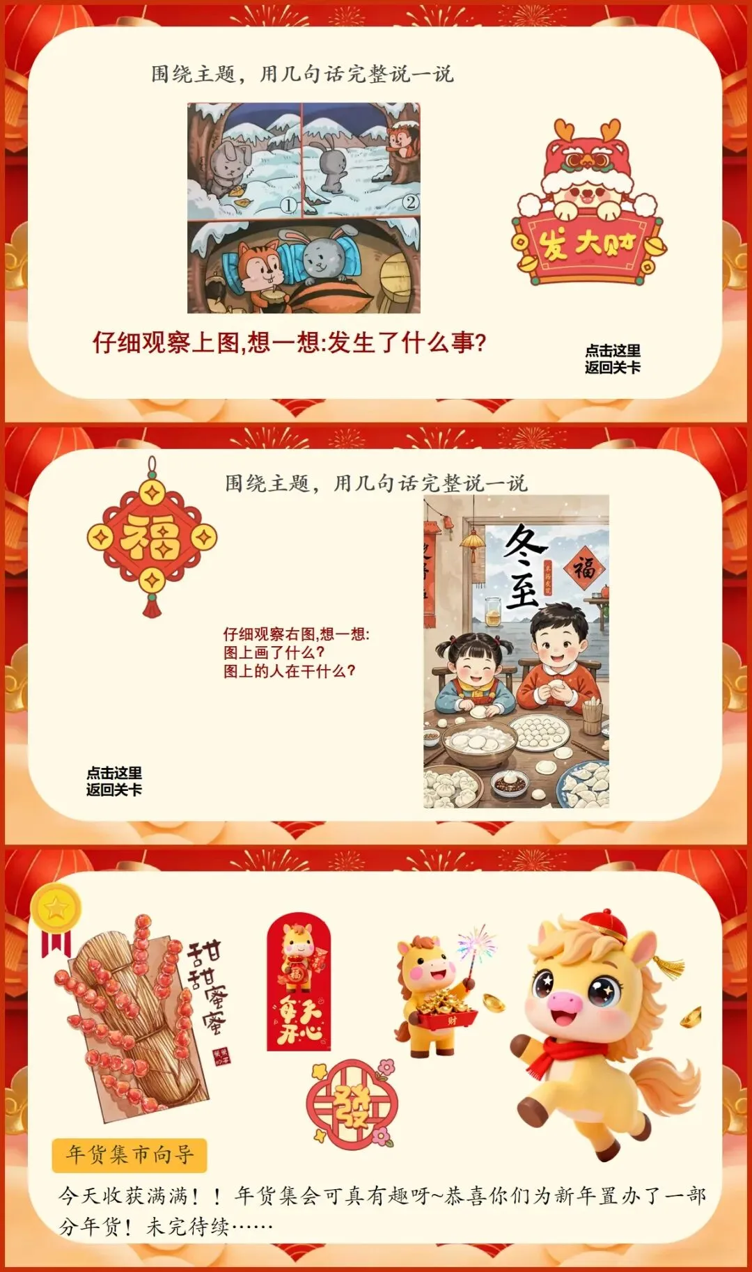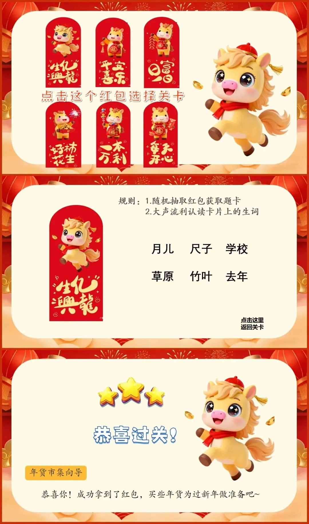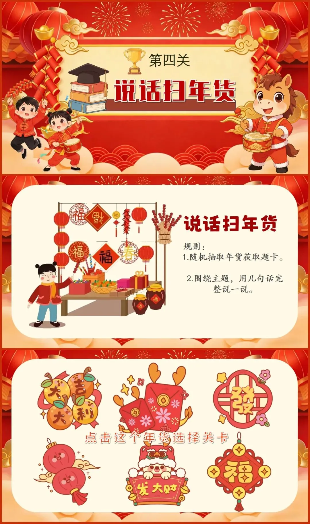 把期末考变成“年货市集闯关”,拼音糖葫芦、生词红包、诵读福袋、说话扫年货,每一关都藏着惊喜!孩子们玩着就把拼音、生字、古诗、看图说话全练了,快乐和知识点双丰收,这才是期末该有的样子~