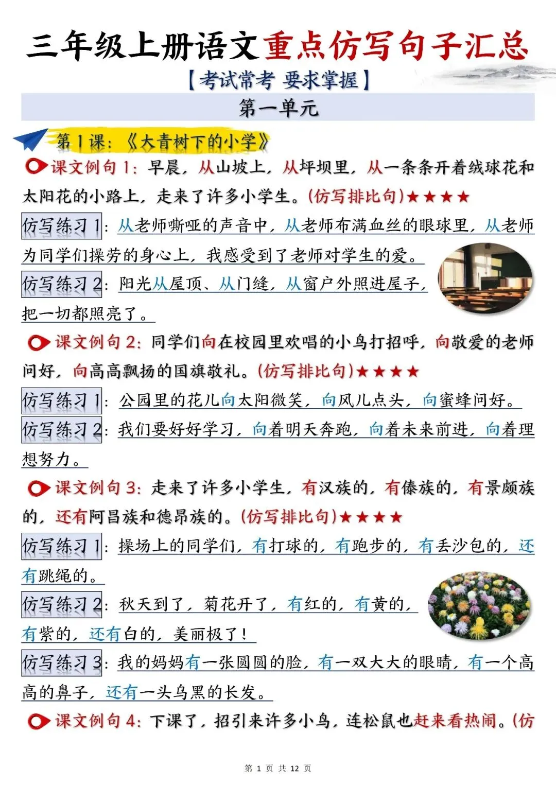 济南小学1-6年级上册语文复习重点仿写句子汇总免费领!PDF电子版高清可打印(附答案)