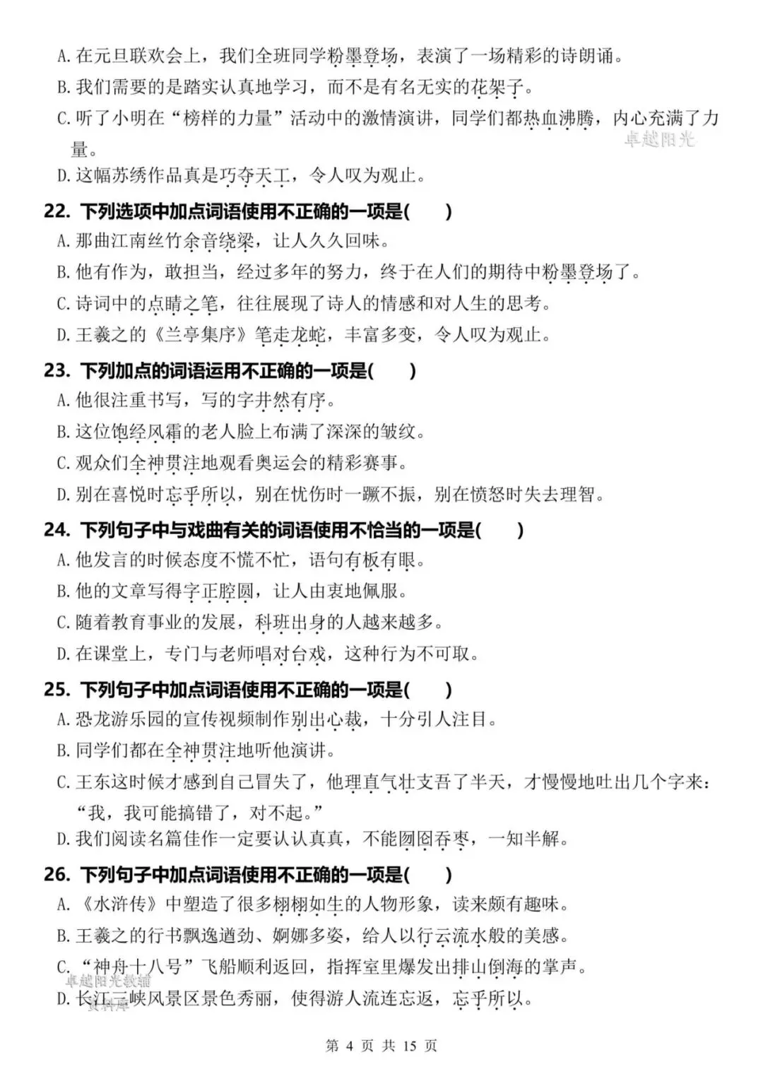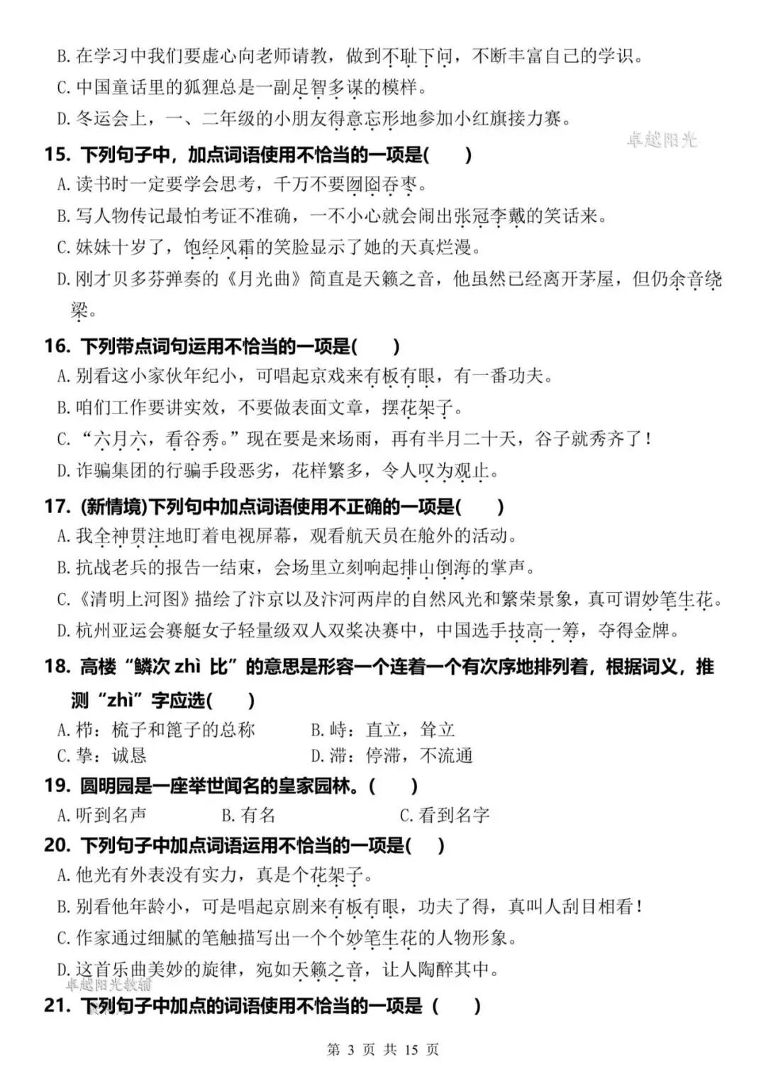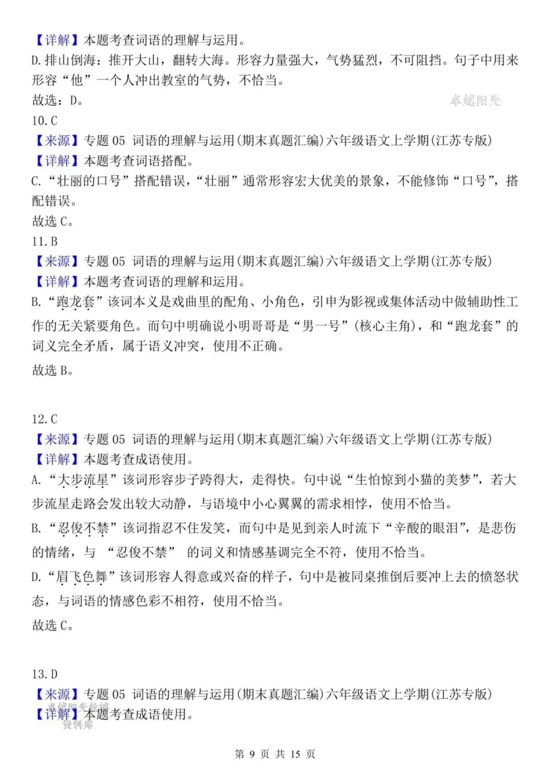 >【资料整理】六年级上册语文期末复习8类高频易错选择题:《词语运用》35道(15页)