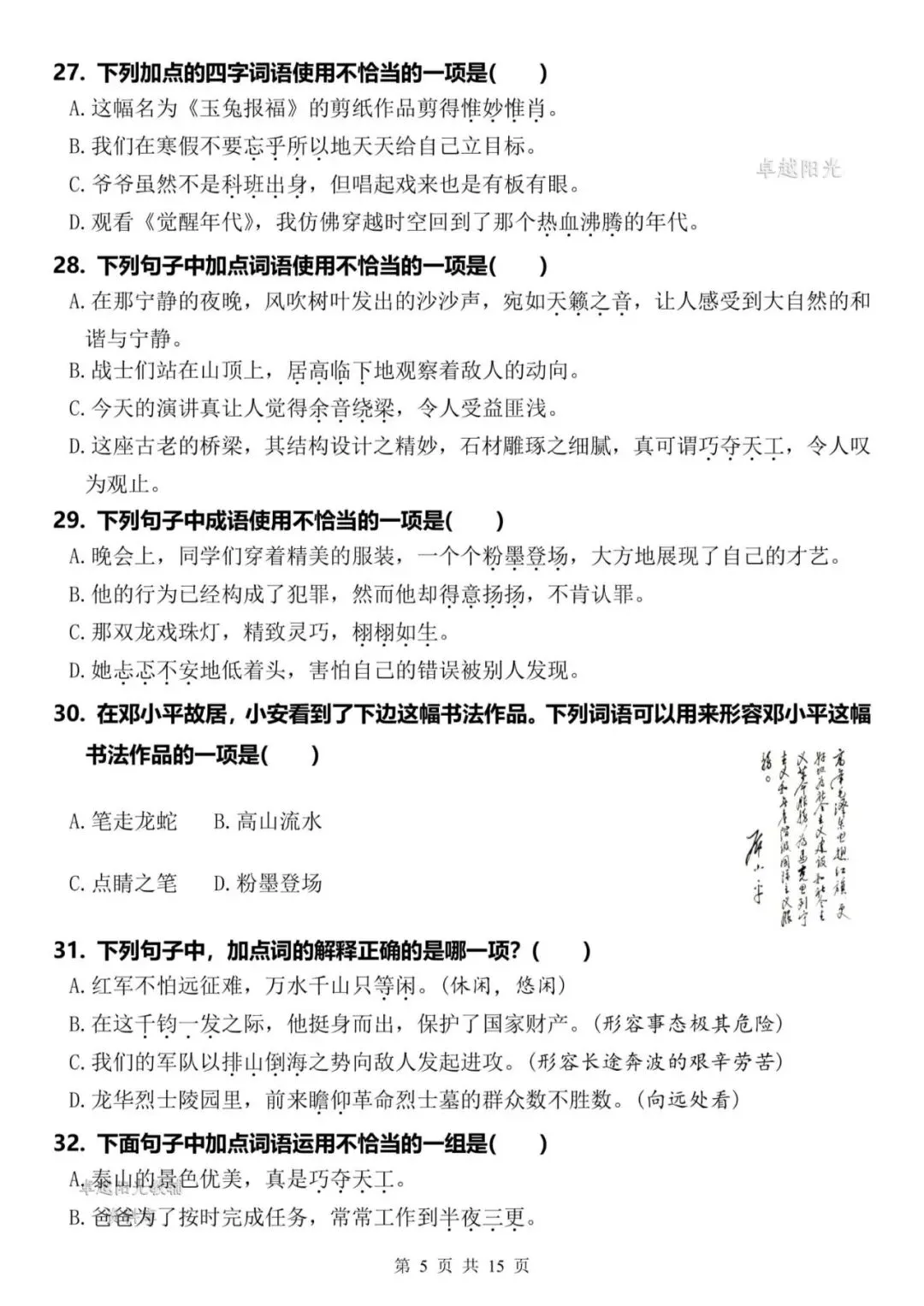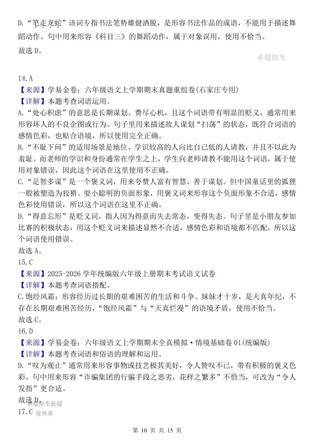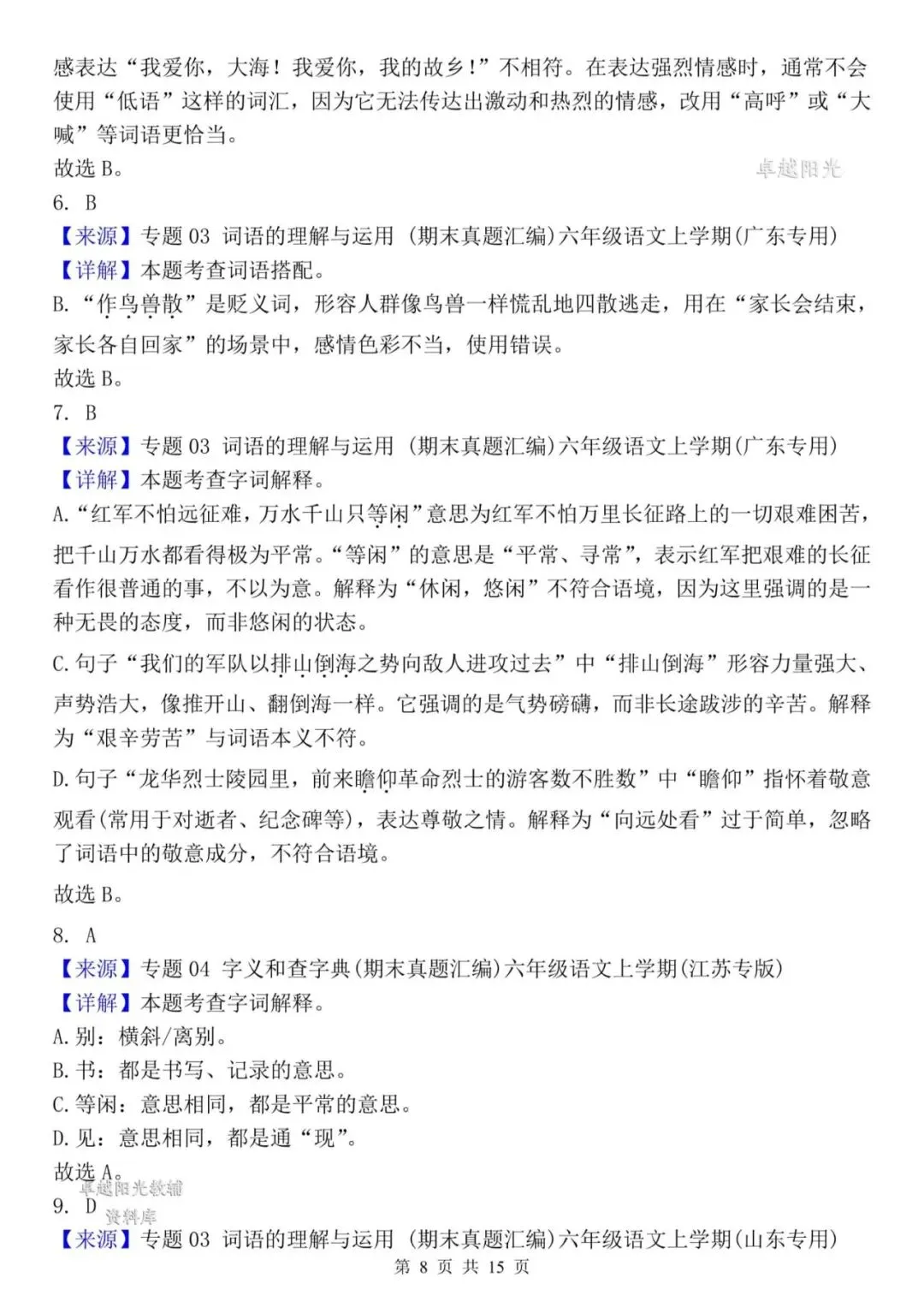 【资料整理】六年级上册语文期末复习8类高频易错选择题:《词语运用》35道(15页)