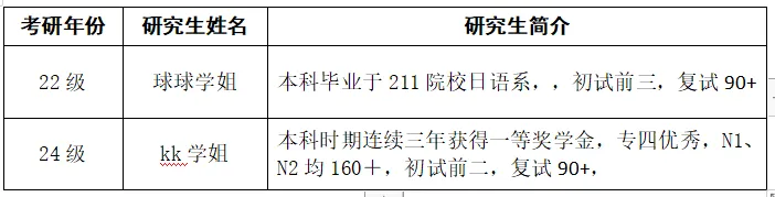 kk学姐,本科时期连续三年获得一等奖学金,专四优秀,N1、N2均160+,初试前二,复试90+,擅长各科目知识点提炼、总结,并且总结出一套自己的应试技巧。