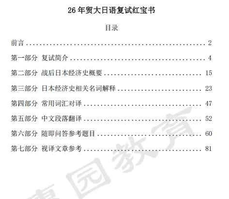 对外经济贸易大学考研复试红宝书来袭!资料共分为七个部分:复试简介、战后日本经济史概要、日本经济史相关名词解释、常用词汇对译、中文段落翻译、随机问答参考题目、视译文章参考,帮助大家在复习备考过程中做到各方面均衡发力!一起来看看最新资料介绍~