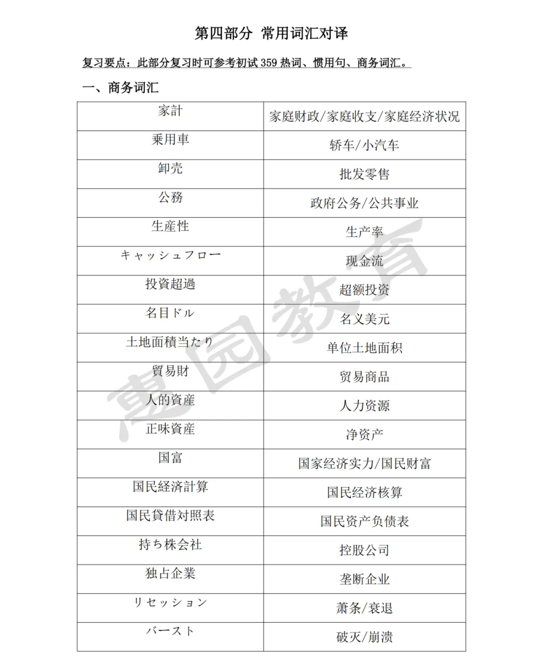 第四部分为常用词汇对译,请大家一定注意,初试结束并不意味着可以忘记初试复习内容,在复试考察过程中,无论是视译还是个人问答环节都会涉及词汇的考察,所以这一部分我们结合初试复习内容为大家整理了常用词汇对译表。不仅要熟记具体意思,也要做到会读、读对!尤其是常见词语,一定要确认自己的读法是否正确,涉及整体日语能力的印象分,一定要注意!