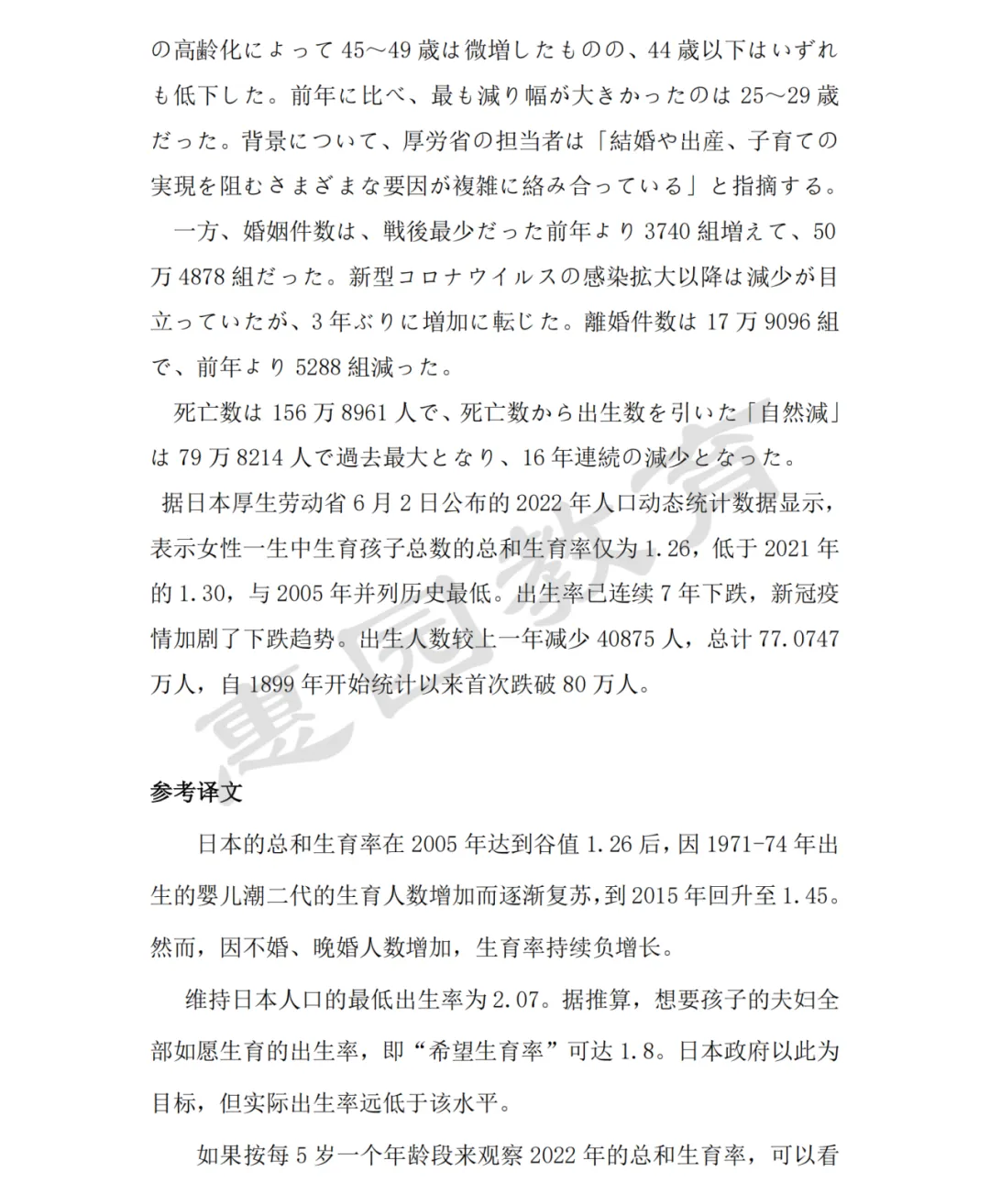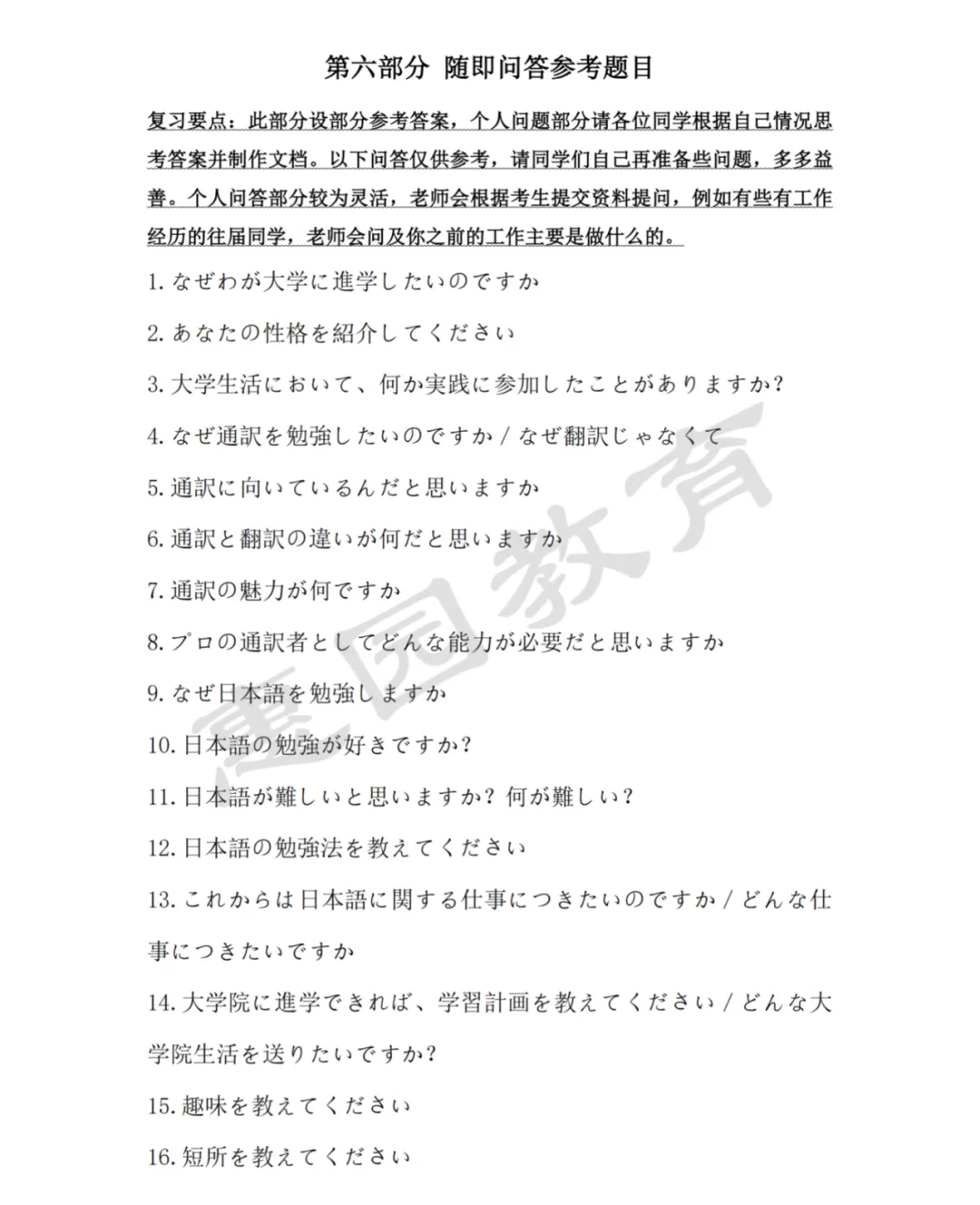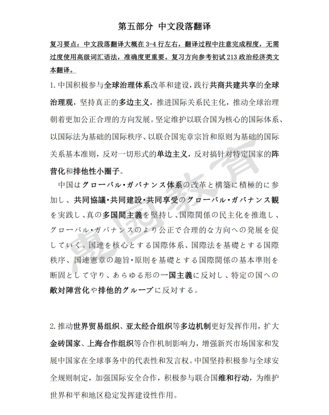 第五部分为中文段落翻译,在复试中汉译日考察相对来说少于日译汉,有些同学会忽视此部分复习,但每年很多同学都会卡在该环节,因此复习过程中一定要均衡发力。内容方面对倾向于政经类。