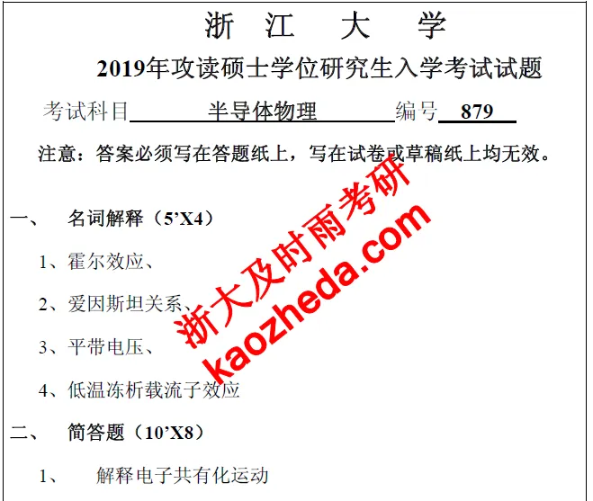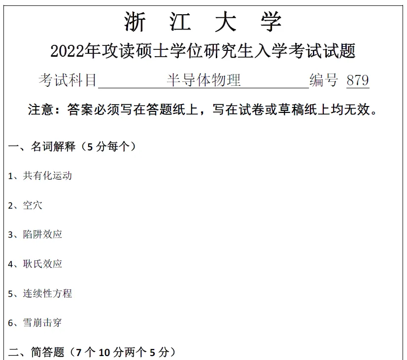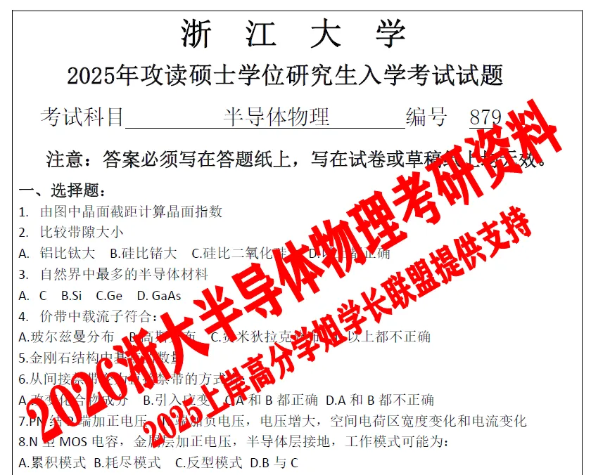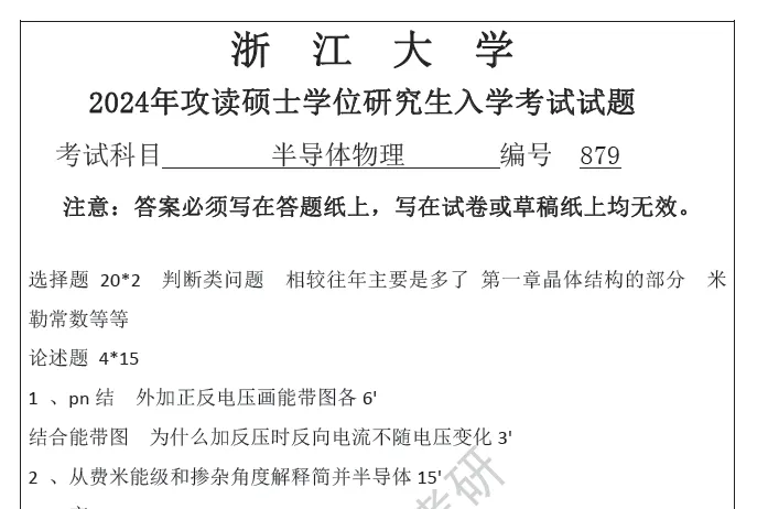 1、2026年浙江大学研究生入学考试半导体物理(879)模拟题预测题一