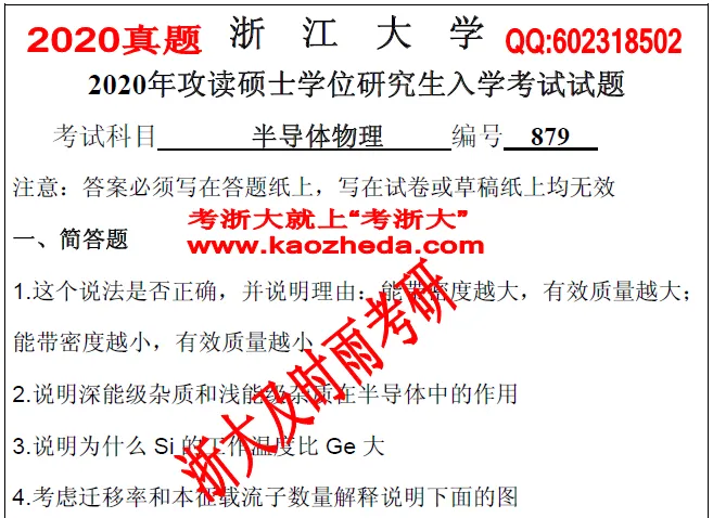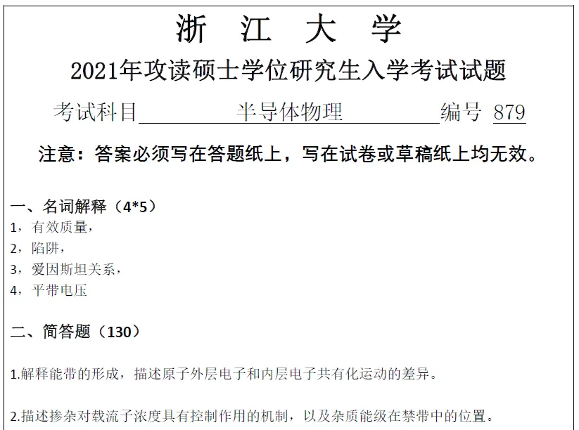2、2026年浙江大学研究生入学考试半导体物理(879)模拟题预测题二