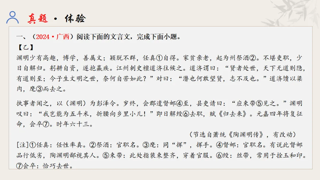 4.陶渊明的一生,做官时间短暂,更多的是田园归隐。结合甲、乙两文,具体分析其归隐的原因。