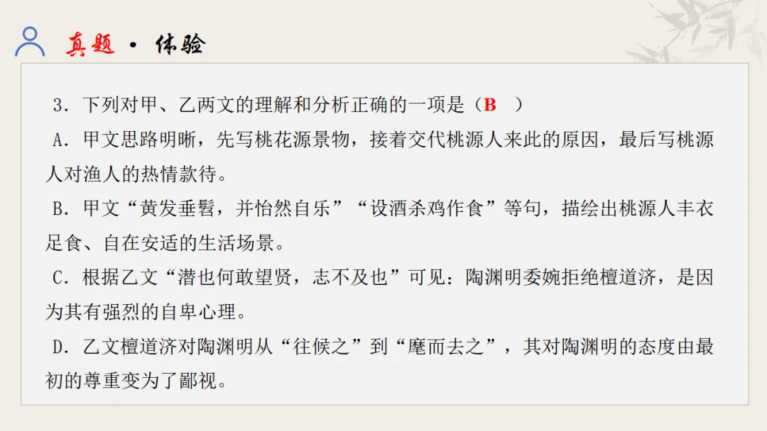 B.甲文“黄发垂髫,并怡然自乐”“设酒杀鸡作食”等句,描绘出桃源人丰衣足食、自在安适的生活场景。