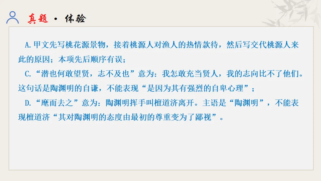 C.根据乙文“潜也何敢望贤,志不及也”可见:陶渊明委婉拒绝檀道济,是因为其有强烈的自卑心理。