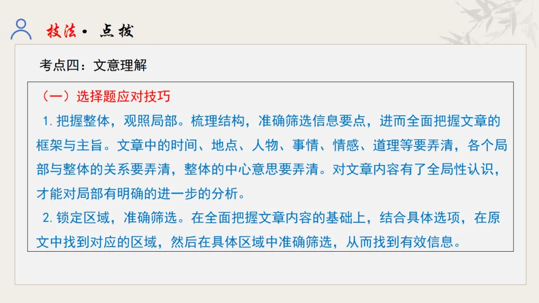 1.把握整体,观照局部。梳理结构,准确筛选信息要点,进而全面把握文章的框架与主旨。文章中的时间、地点、人物、事情、情感、道理等要弄清,各个局部与整体的关系要弄清,整体的中心意思要弄清。对文章内容有了全局性认识,才能对局部有明确的进一步的分析。