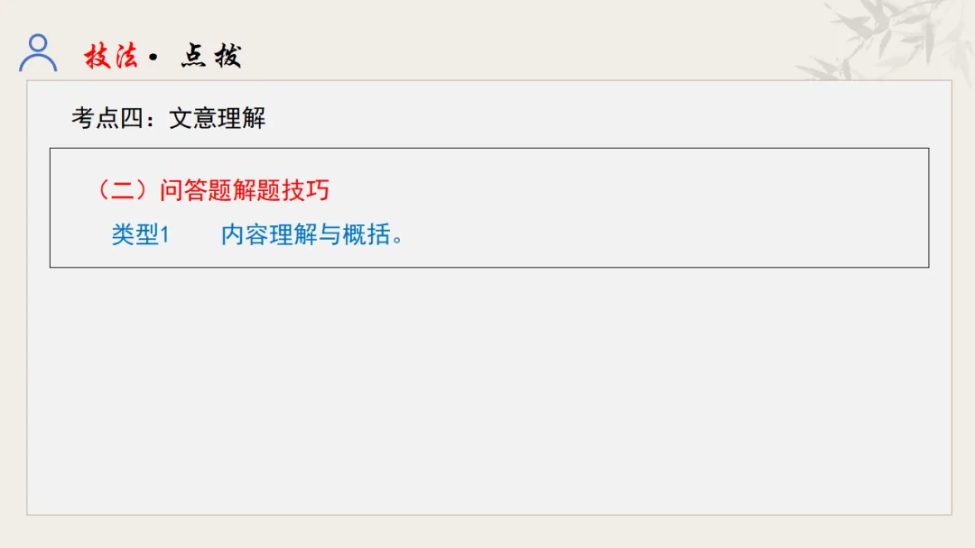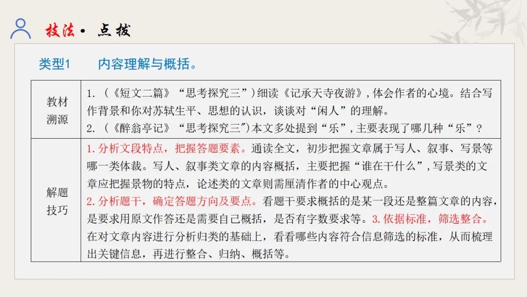 解题技巧 | 1.分析文段特点,把握答题要素。通读全文,初步把握文章属于写人、叙事、写景等哪一类体裁。写人、叙事类文章的内容概括,主要把握“谁在干什么”,写景类的文章应把握景物的特点,论述类的文章则需厘清作者的中心观点。2.分析题干,确定答题方向及要点。看题干要求概括的是某一段还是整篇文章的内容,是要求用原文作答还是需要自己概括,是否有字数要求等。3.依据标准,筛选整合。在对文章内容进行分析归类的基础上,看看哪些内容符合信息筛选的标准,从而梳理出关键信息,再进行整合、归纳、概括等。 |