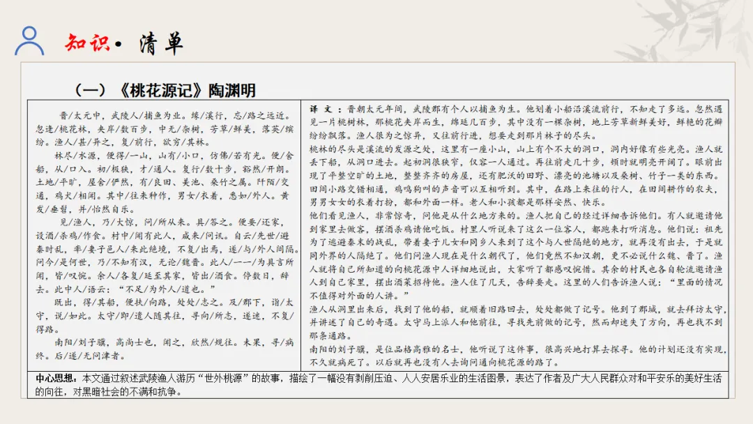 中心思想:本文通过叙述武陵渔人游历“世外桃源”的故事,描绘了一幅没有剥削压迫、人人安居乐业的生活图景,表达了作者及广大人民群众对和平安乐的美好生活的向往,对黑暗社会的不满和抗争。 |