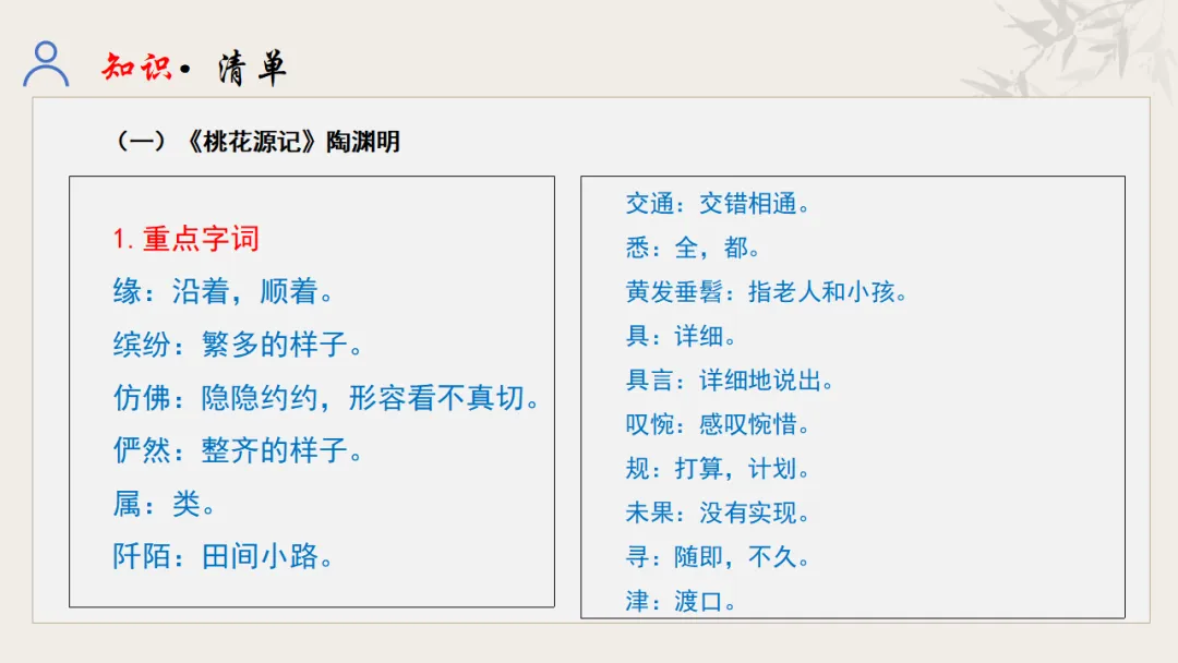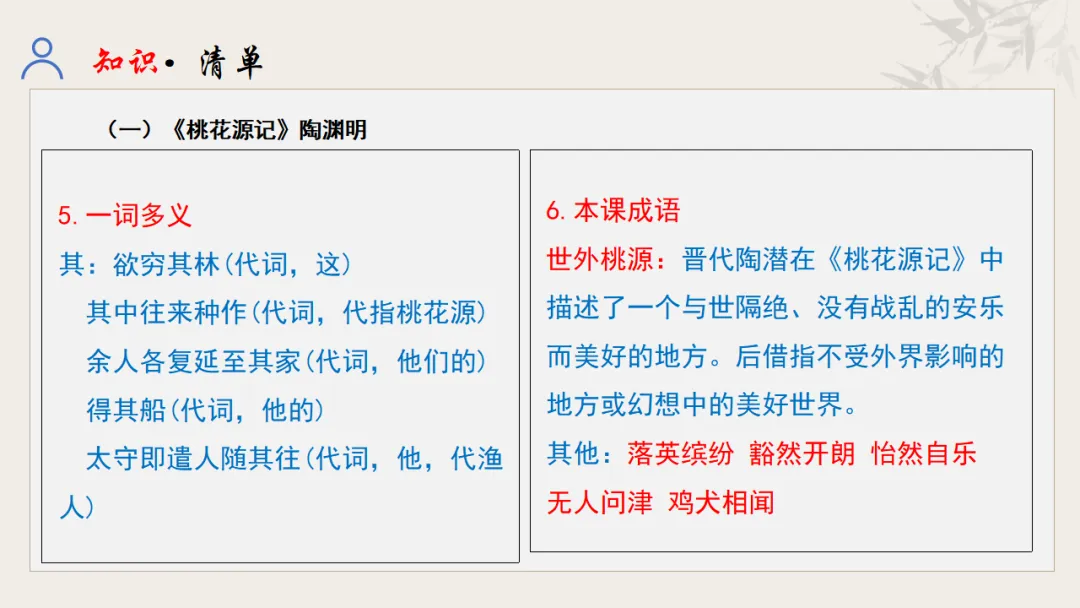 【甲】桃林在溪水发源的地方就到头了,渔人就发现了一座小山,山上有个小洞口,洞里面隐隐约约透着点光亮。渔人便下了船,从洞口走了进去。刚开始非常狭窄,仅容一人通过。又向前行走了几十步,突然变得开阔明亮。渔人眼前这片土地平坦开阔,房屋排列得非常整齐,还有肥沃的田地、美丽的池塘,以及桑树、竹子这类的植物。田间小路交错相通,(村落间)可以互相听到鸡鸣狗叫的声音。人们在田间来来往往耕种劳作,男女的穿戴装束,完全如同世俗之外的人一样。老年人和小孩儿都高兴而满足。