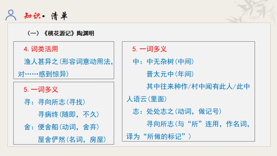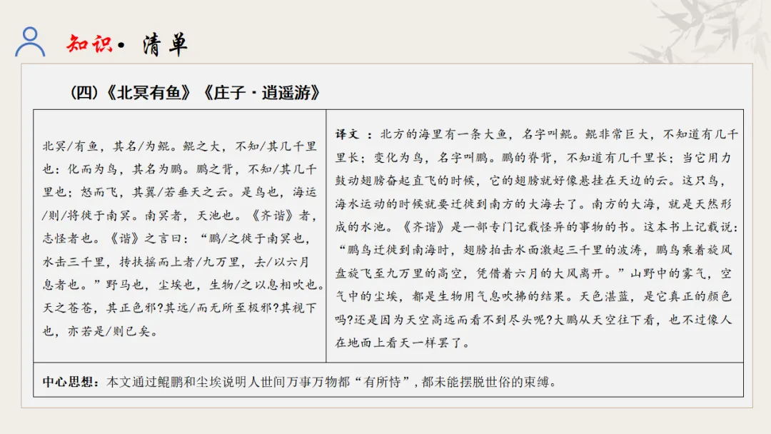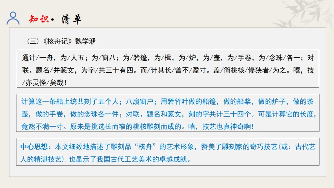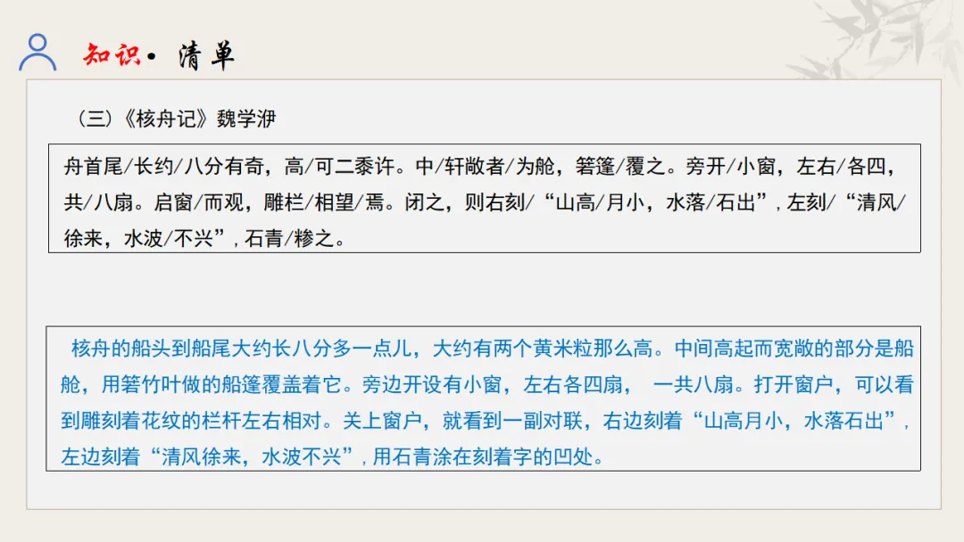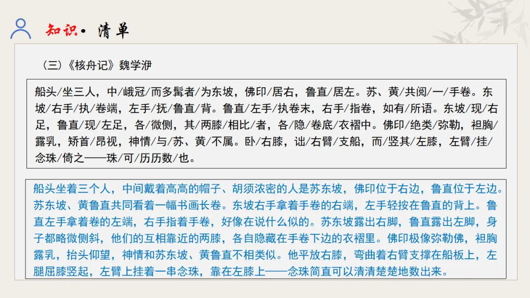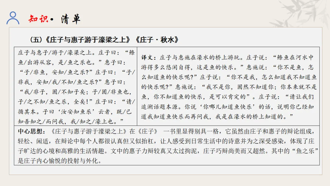 教材溯源 | 1. (《短文二篇》“思考探究三”)细读《记承天寺夜游》,体会作者的心境。结合写作背景和你对苏轼生平、思想的认识,谈谈对“闲人”的理解。2. (《醉翁亭记》“思考探究三")本文多处提到“乐”,主要表现了哪几种“乐”? |