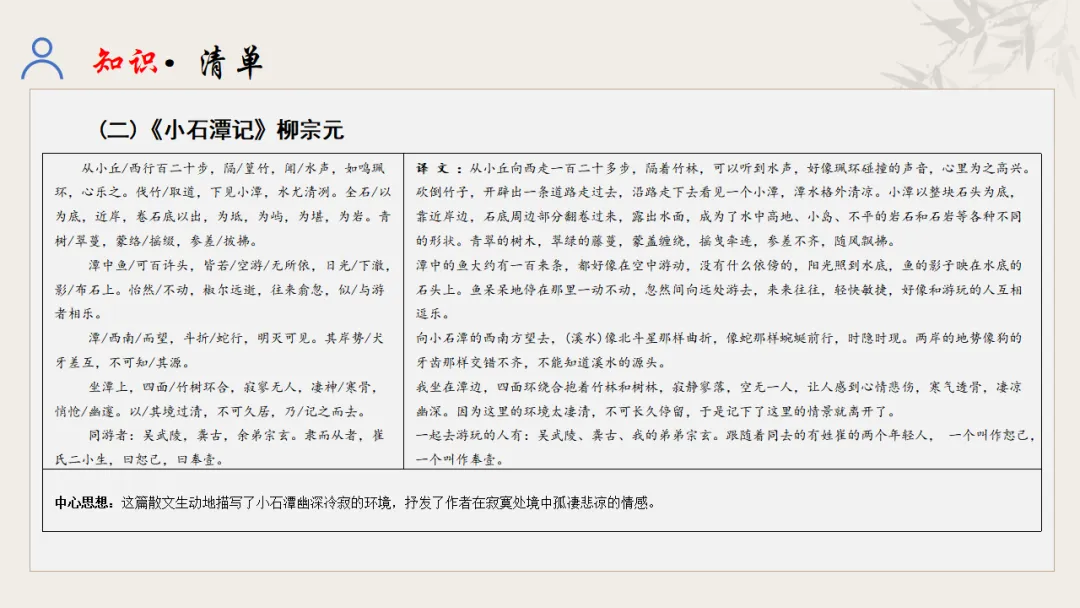 中心思想:这篇散文生动地描写了小石潭幽深冷寂的环境,抒发了作者在寂寞处境中孤凄悲凉的情感。 |