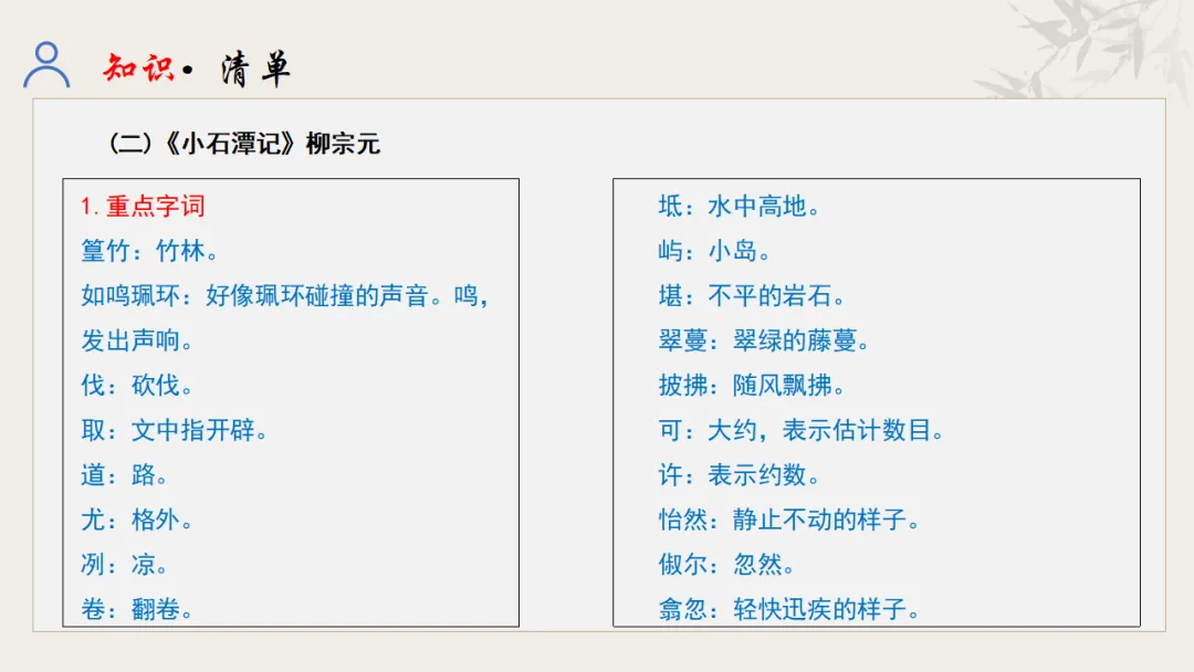 从小丘/西行百二十步,隔/篁竹,闻/水声,如鸣珮环,心乐之。伐竹/取道,下见小潭,水尤清冽。全石/以为底,近岸,卷石底以出,为坻,为屿,为堪,为岩。青树/翠蔓,蒙络/摇缀,参差/披拂。潭中鱼/可百许头,皆若/空游/无所依,日光/下澈,影/布石上。怡然/不动,椒尔远逝,往来翕忽,似/与游者相乐。潭/西南/而望,斗折/蛇行,明灭可见。其岸势/犬牙差互,不可知/其源。坐潭上,四面/竹树环合,寂寥无人,凄神/寒骨,悄怆/幽邃。以/其境过清,不可久居,乃/记之而去。同游者:吴武陵,龚古,余弟宗玄。隶而从者,崔氏二小生,曰恕己,曰奉壹。 | 译文:从小丘向西走一百二十多步,隔着竹林,可以听到水声,好像珮环碰撞的声音,心里为之高兴。砍倒竹子,开辟出一条道路走过去,沿路走下去看见一个小潭,潭水格外清凉。小潭以整块石头为底,靠近岸边,石底周边部分翻卷过来,露出水面,成为了水中高地、小岛、不平的岩石和石岩等各种不同的形状。青翠的树木,翠绿的藤蔓,蒙盖缠绕,摇曳牵连,参差不齐,随风飘拂。潭中的鱼大约有一百来条,都好像在空中游动,没有什么依傍的,阳光照到水底,鱼的影子映在水底的石头上。鱼呆呆地停在那里一动不动,忽然间向远处游去,来来往往,轻快敏捷,好像和游玩的人互相逗乐。向小石潭的西南方望去,(溪水)像北斗星那样曲折,像蛇那样蜿蜒前行,时隐时现。两岸的地势像狗的牙齿那样交错不齐,不能知道溪水的源头。我坐在潭边,四面环绕合抱着竹林和树林,寂静寥落,空无一人,让人感到心情悲伤,寒气透骨,凄凉幽深。因为这里的环境太凄清,不可长久停留,于是记下了这里的情景就离开了。一起去游玩的人有:吴武陵、龚古、我的弟弟宗玄。跟随着同去的有姓崔的两个年轻人,一个叫作恕己,一个叫作奉壹。 |