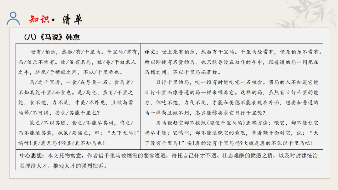 各地中考文言文的阅读材料,有课内与课外分开的,也有课内与课外对比阅读的,还有完全选择了课外语段的。但无论怎样选择,我们都要立足于课内,然后举一反三,培养迁移能力。近年来,中考文言文阅读材料的选取大都有这样的特点:文中多数字词属于常见的实词和虚词,即使有少数生僻字词,或选文中出现不常见的典故,也会安排注释以降低难度,让考生在初中文言文学习的基础上“跳一跳就能摘到果子”,能够理解大意。