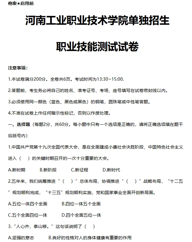 同学们大家好,今天给大家汇总整理的资料是河南工业职业技术学院2024年单招真题复习试题资料,需要的同学可自行下载打印。【