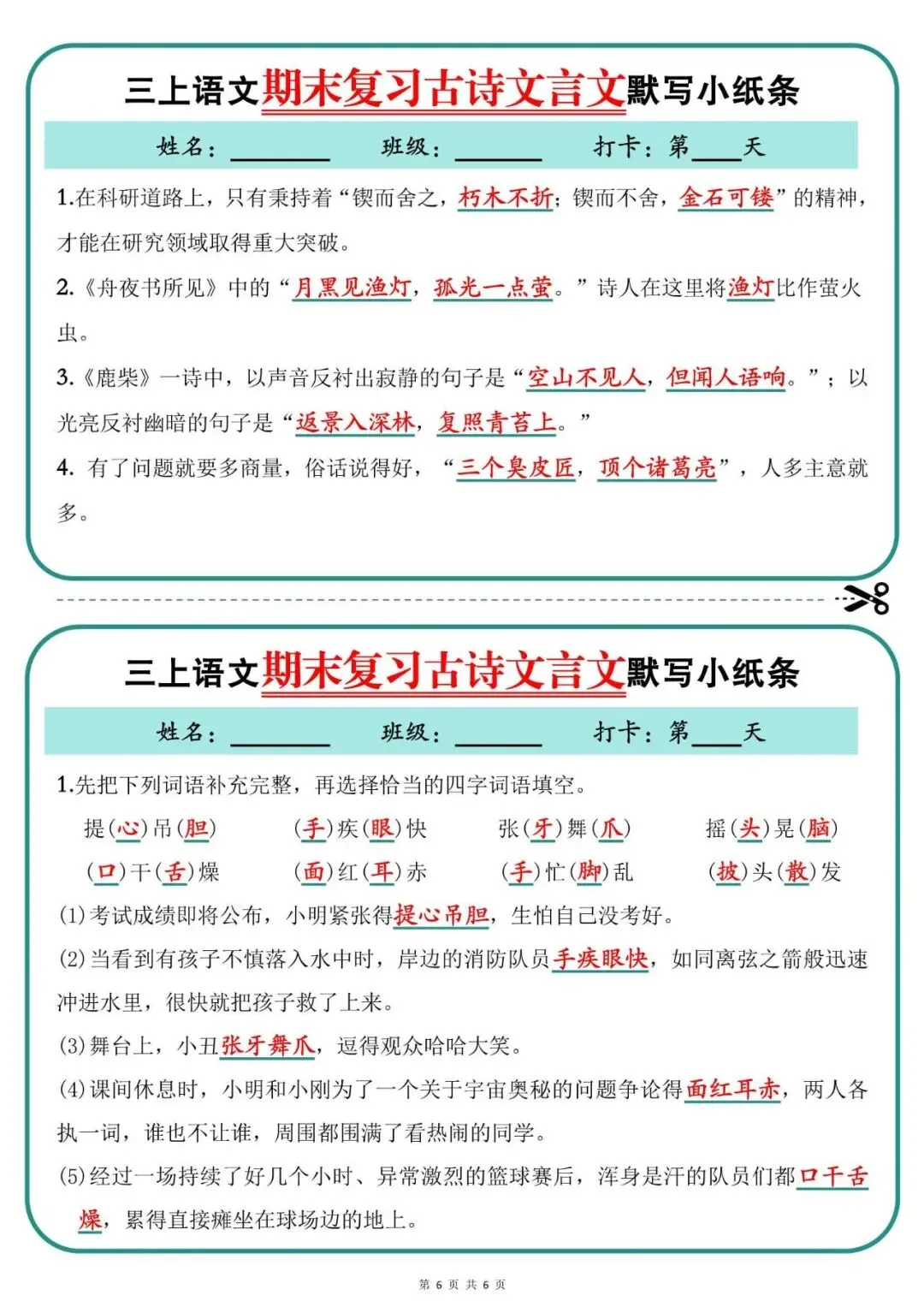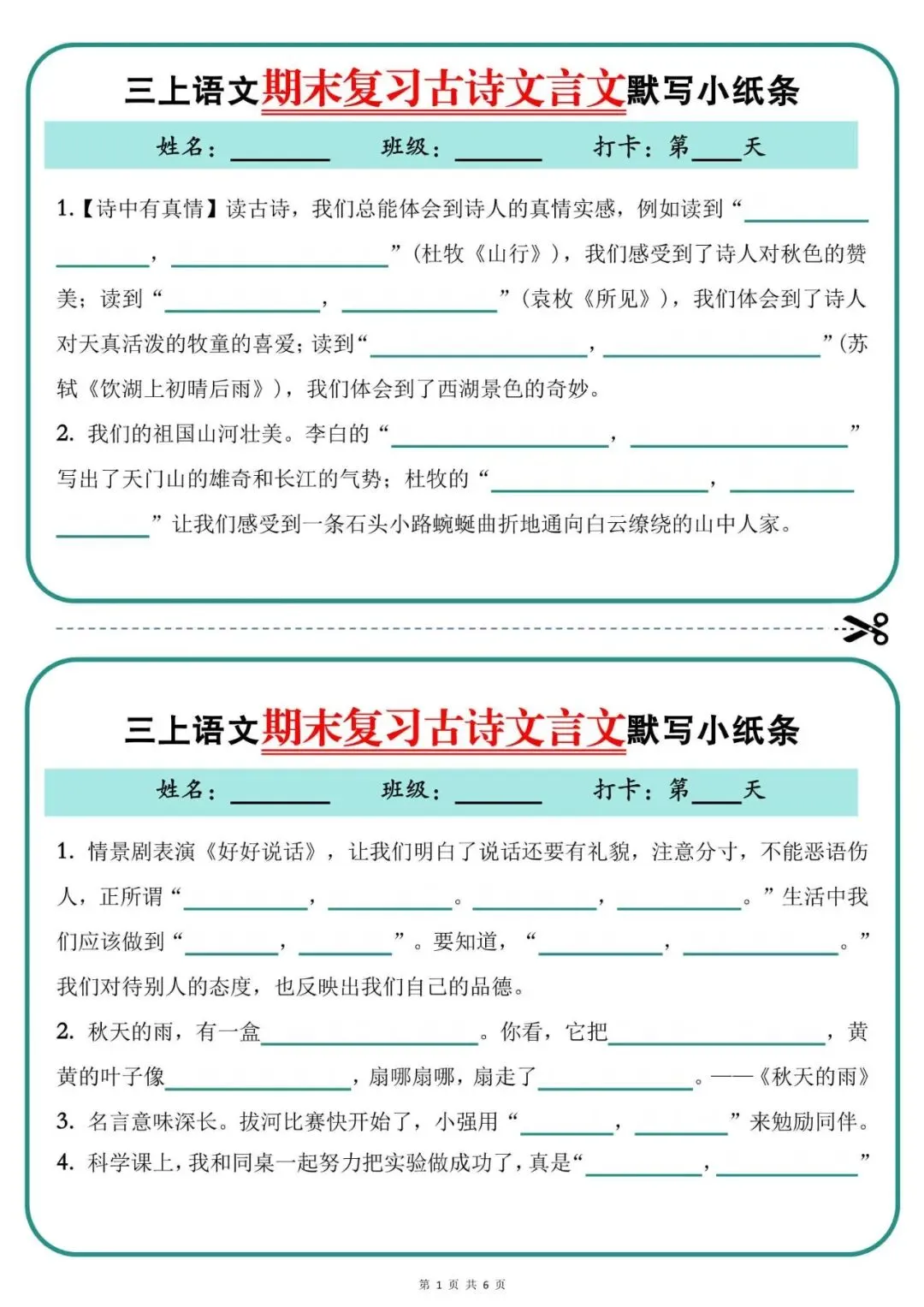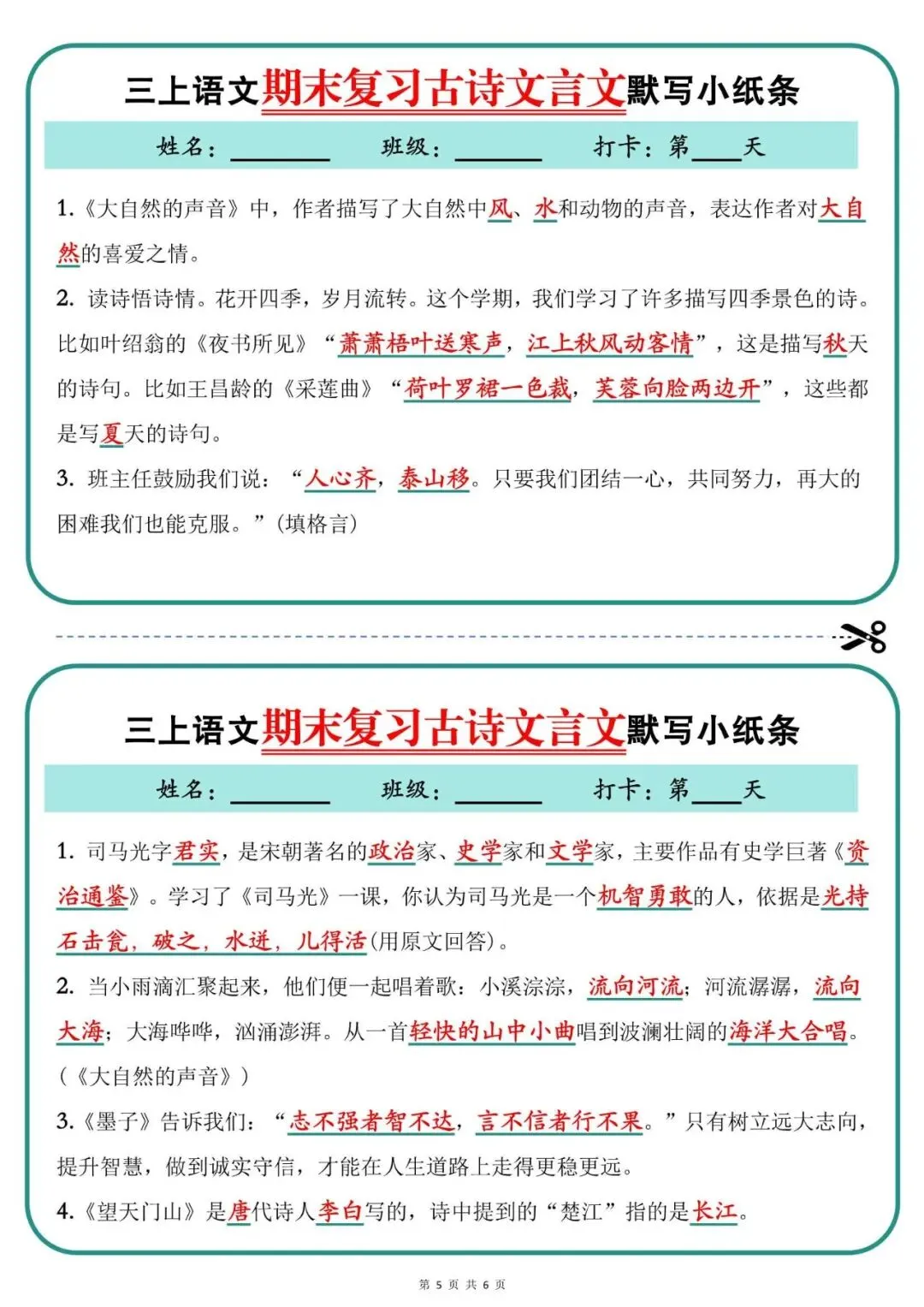 【资料整理】三年级上册语文期末复习古诗文言文默写小纸条