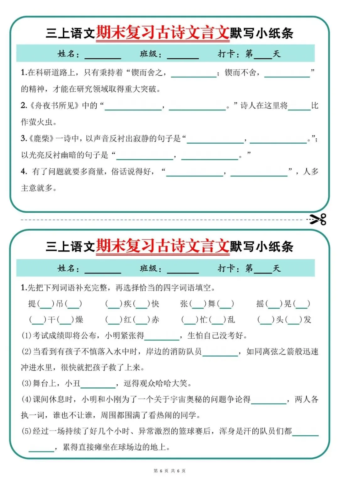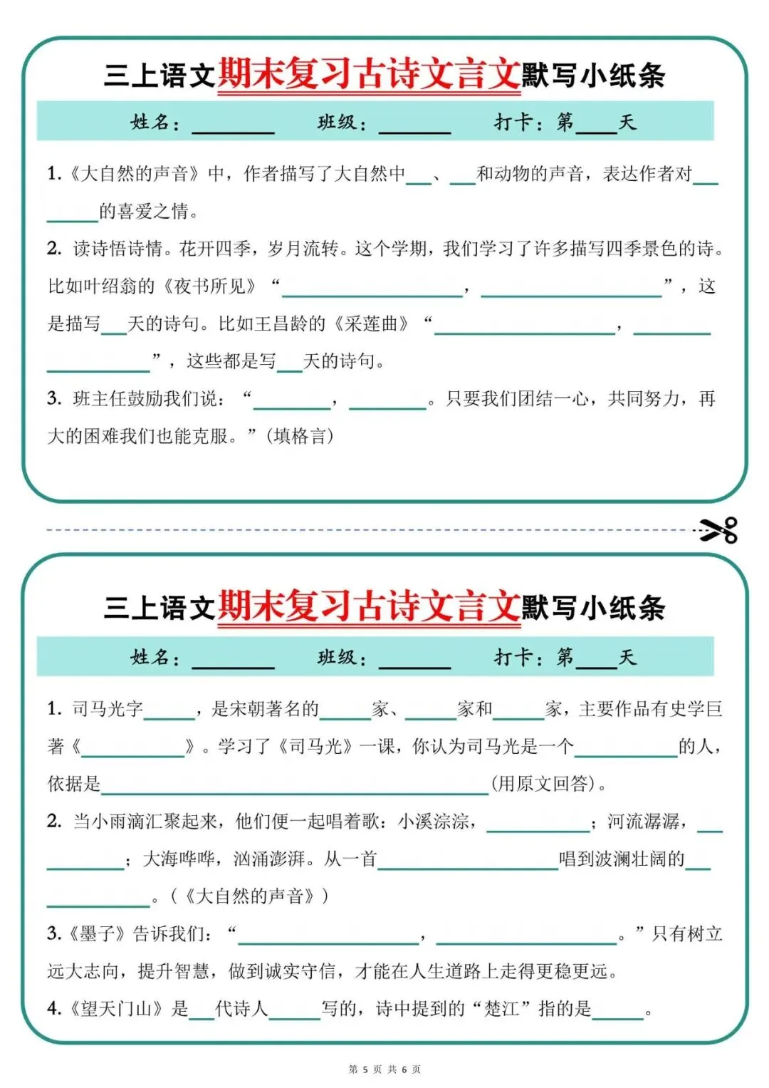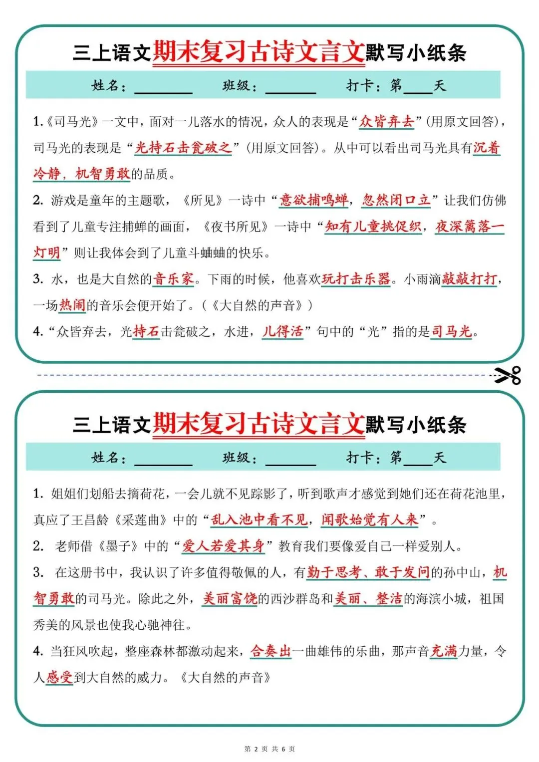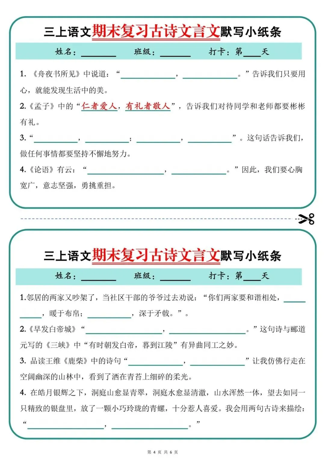 >【资料整理】三年级上册语文期末复习古诗文言文默写小纸条