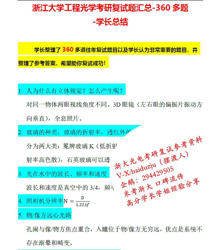 22.浙大光学工程往年2018及之前复试题目(学长收集,市面流行版)
