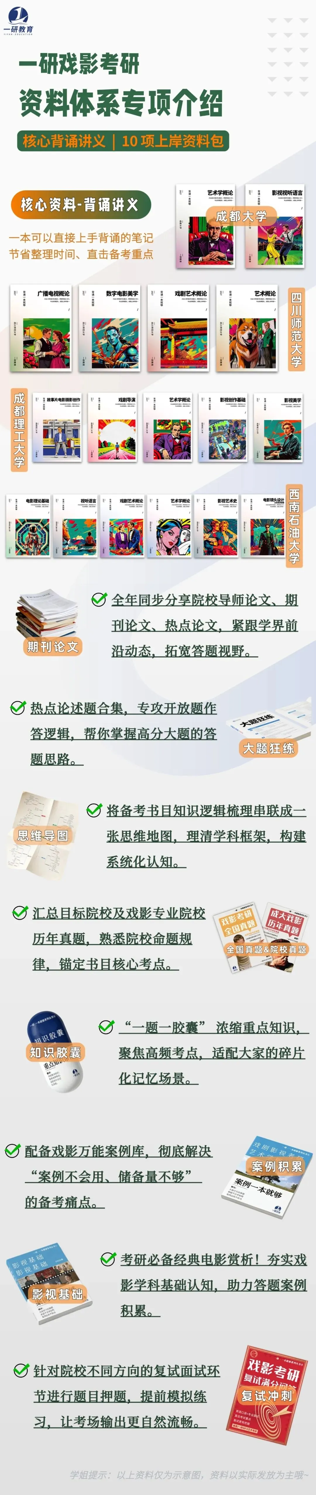 比如25级川师戏影10月考纲发布,将专二书目的《电影学导论》变更为《数字电影美学》,一研8月份已经开始备课写资料,9月份已经给大家开始上课!23级成大戏影新增王宏建版本《艺术概论》,考纲发布时一研学员已学完整本书!