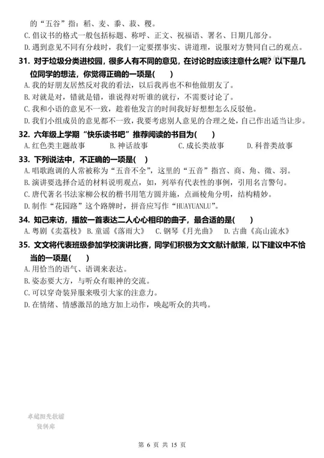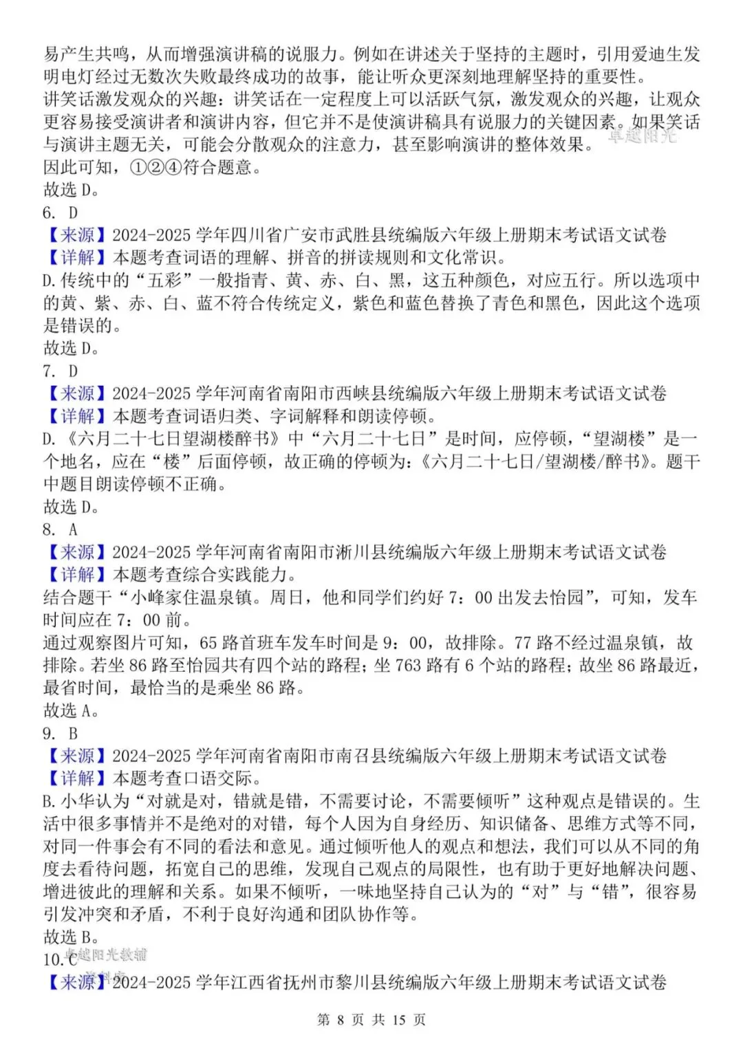 >【资料整理】六年级上册语文期末复习8类高频易错选择题:《语文园地与口语交际》35道(15页)