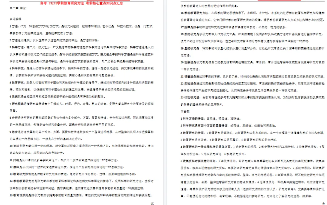 无论你是备考初期需要夯实基础、搭建知识框架,还是冲刺阶段想要借助真题提升应试能力,亦或是被某一难点困住难以突破,这份资料都能精准匹配你的需求。对于正为13213《学前教育研究方法》全力奋战的自考考生来说,这样一份直击复习核心、助力高效提分的资料,无疑是不容错过的备考利器。