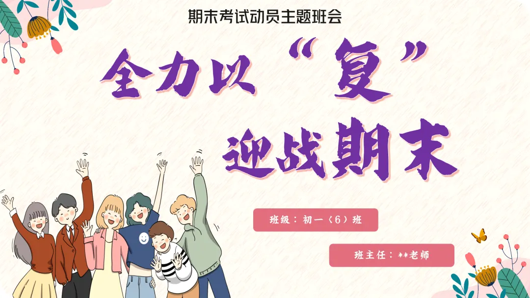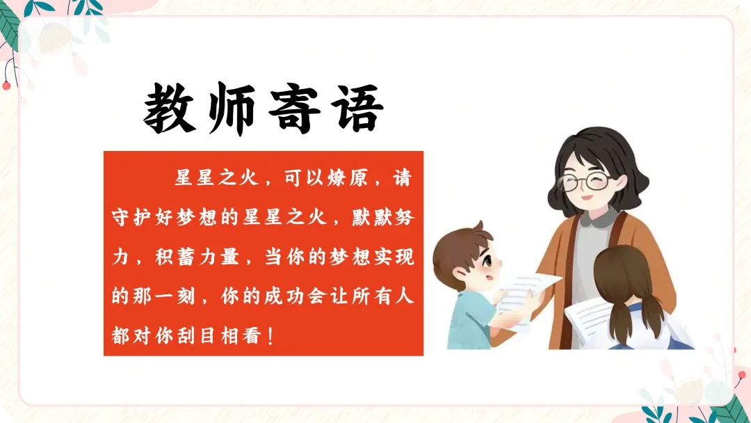 最后,我想送给同学们一句话:星星之火,可以燎原,请守护好梦想的星星之火,默默努力,积蓄力量,当你的梦想实现的那一刻,你的成功会让所有人都对你刮目相看!希望同学们都能在期末考试中取得优异的成绩,为这一学期的学习画上一个圆满的句号。