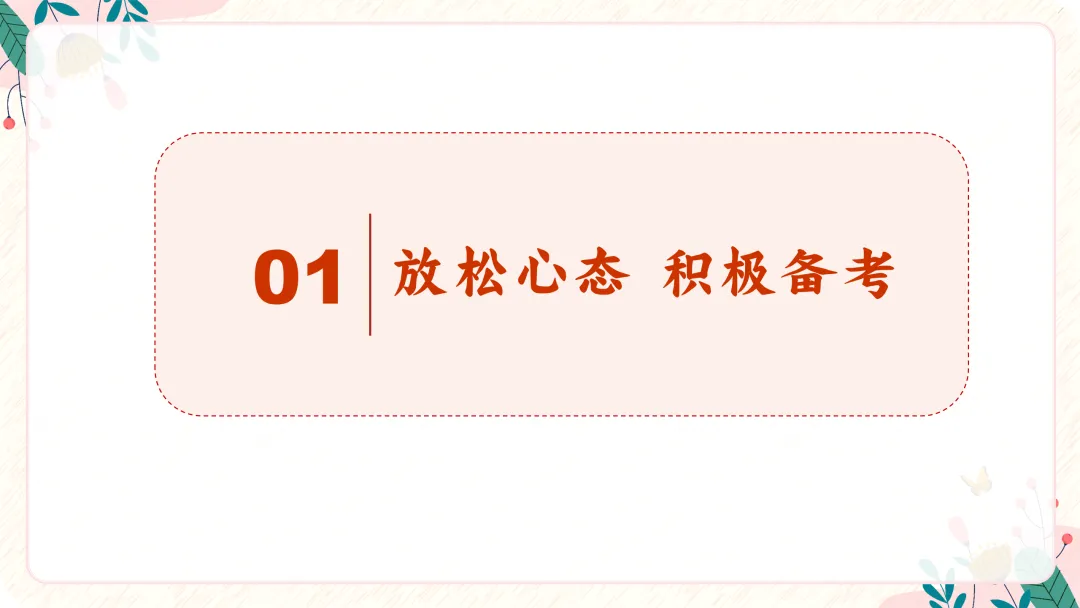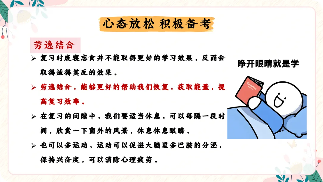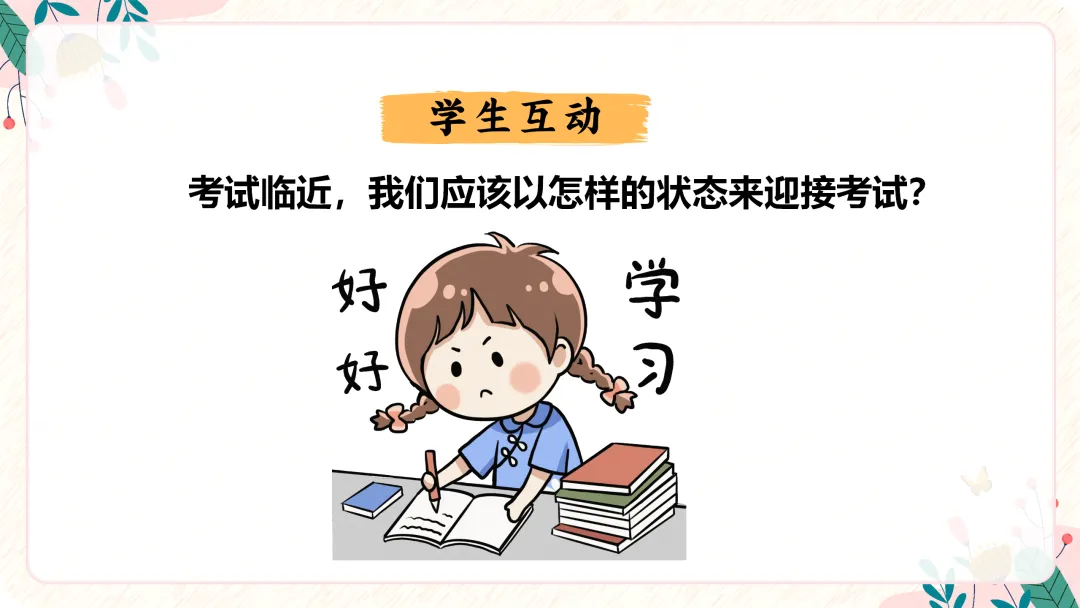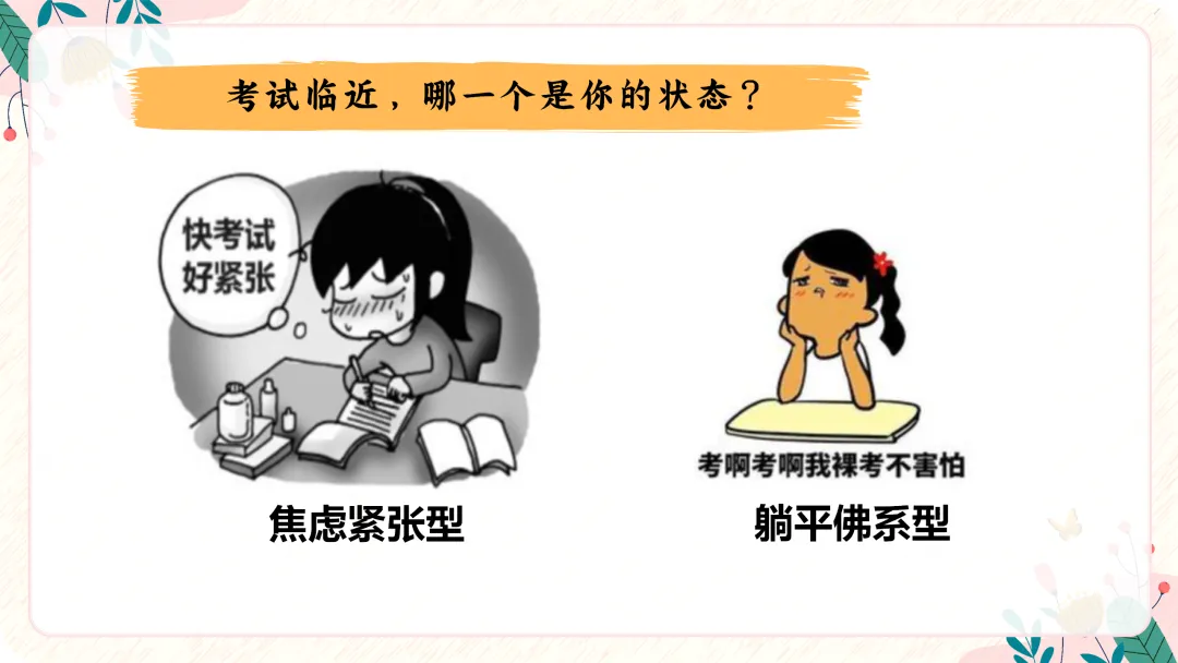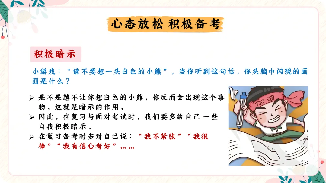 很高兴在这与您相遇,如果您是一位班主任老师,每天除了应对繁重的教学工作,还要加班整理班级、教务、教研、课件PPT资料,请关注下方的“春雨教务资料”,让我们风雨同路、一起成长~今天分享的是中小学期末复习期末动员主题班会的ppt课件及配套的发言稿,主题是《全力以复,迎战期末》。P8 心态放松积极备考 - 接纳情绪