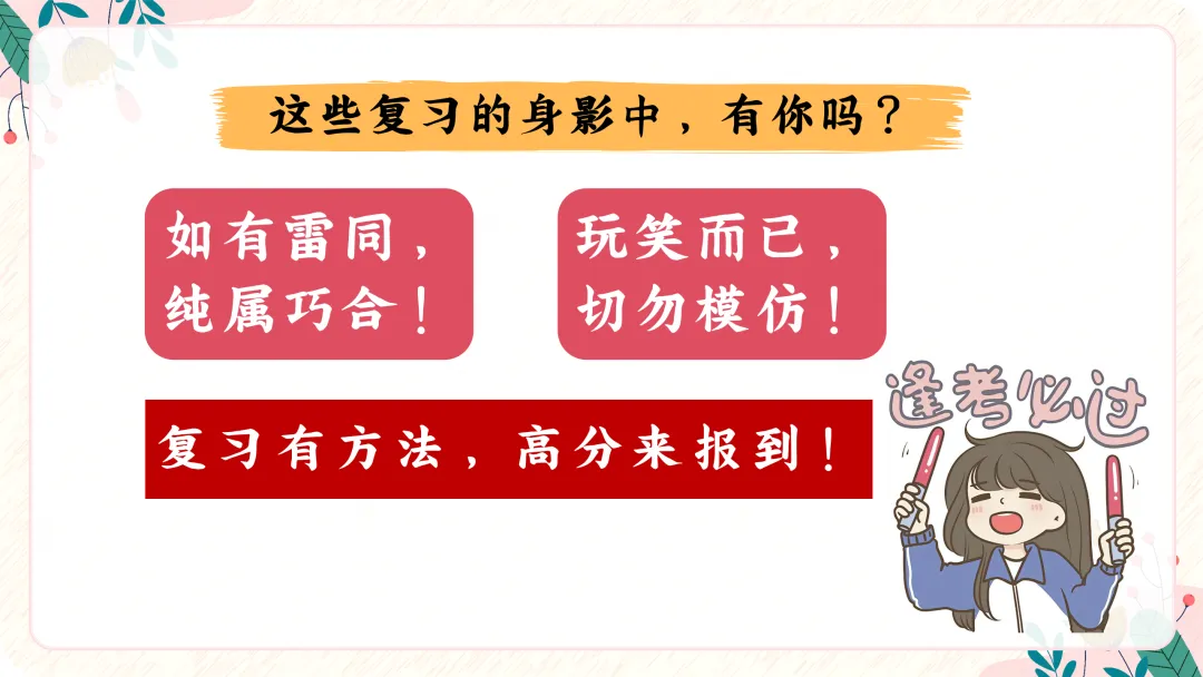 同学们,在复习过程中,有没有一些错误的复习方法呢?比如“绝地反击 根本不用复习法”,考试的时候带上一支红笔,边做边给自己评分,然后老师改卷时会以为P15 玩笑而已,切勿模仿!