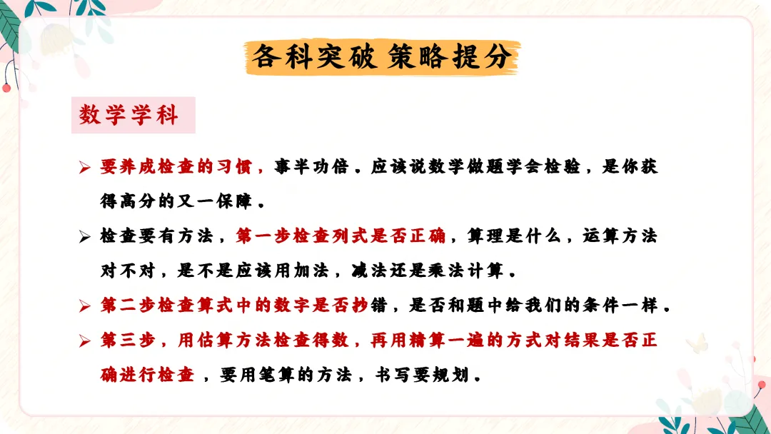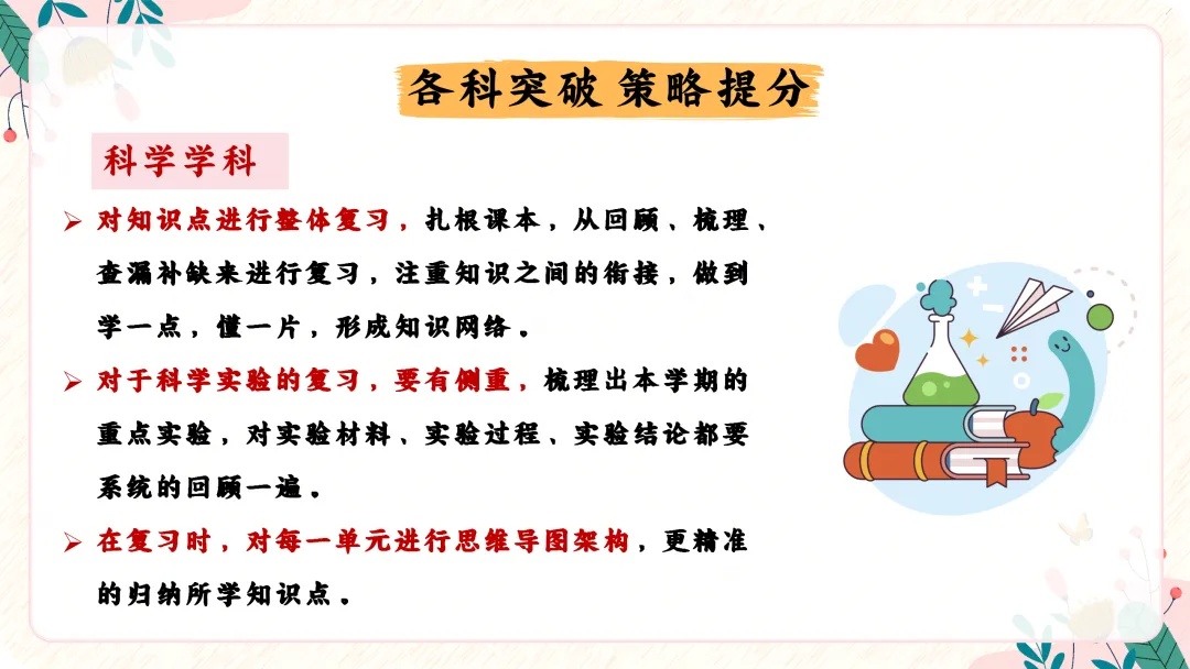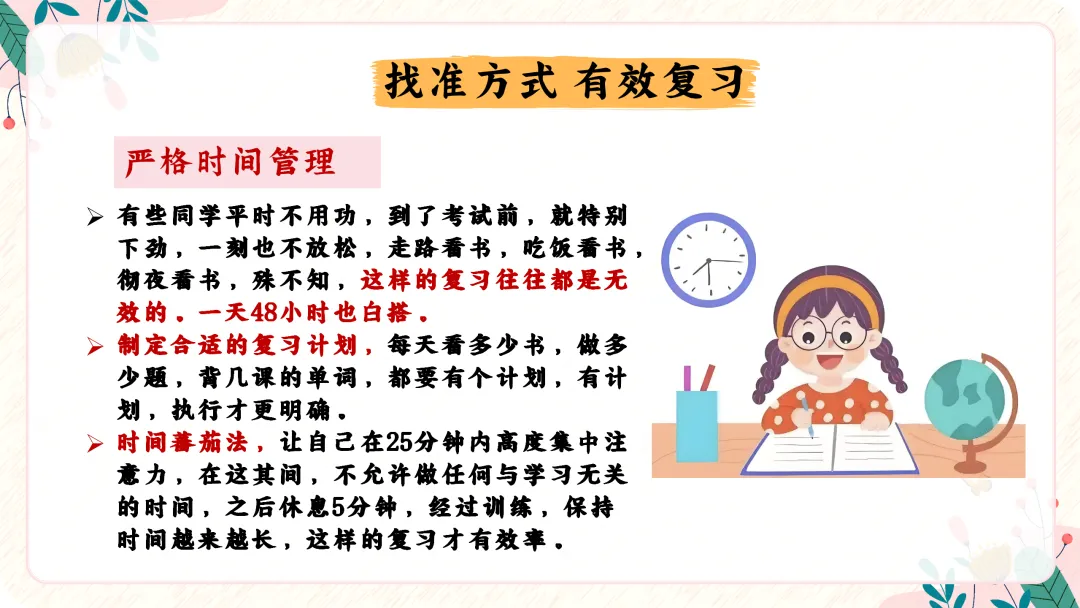 严格时间管理也是复习中非常重要的一环。有些同学平时不用功,到了考试前,就特别下劲,一刻也不放松,走路看书,吃饭看书,彻夜看书。殊不知,这样的复习往往都是无效的。我们要制定合适的复习计划,每天看多少书,做多少题,背几课P23 各科突破策略提分 - 英语学科