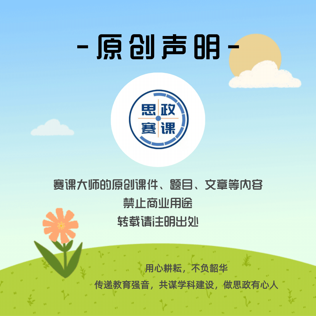 资料会进行年度更新,可凭购买凭证免费获取最新版本。如果您想进一步了解本推文中的资料,如果您有初高中思政赛课、公开课、命题与说题的构思与想法、以及PPT美化需要与专业的团队探讨和打磨,请加小客服微信与我们联系,我们提供一对一辅导服务。赛课大师团队一直秉承着和大家共同成长的初心,在探索优质高中思政教学的道路上前进。所以我们的课程展示、学生活动及思考,都会毫无保留地和大家分享。但是,本公众号课例全部原创,具有独创性。课例仅授权购买老师日常上课、教学研究,未经授权不得向其他公众提供本公众号课例或将本公众号课例用于任何商业活动,例如在任意公众平台进行上传或二次售卖、公开募集资金购买等行为。近期团队已发现多起用户未经授权倒卖“思政赛课大师”各类资源的行为,并且已经固定其侵犯著作权、信息网络传播权的诸多证据,团队依法保留对其提起诉讼的权利。
