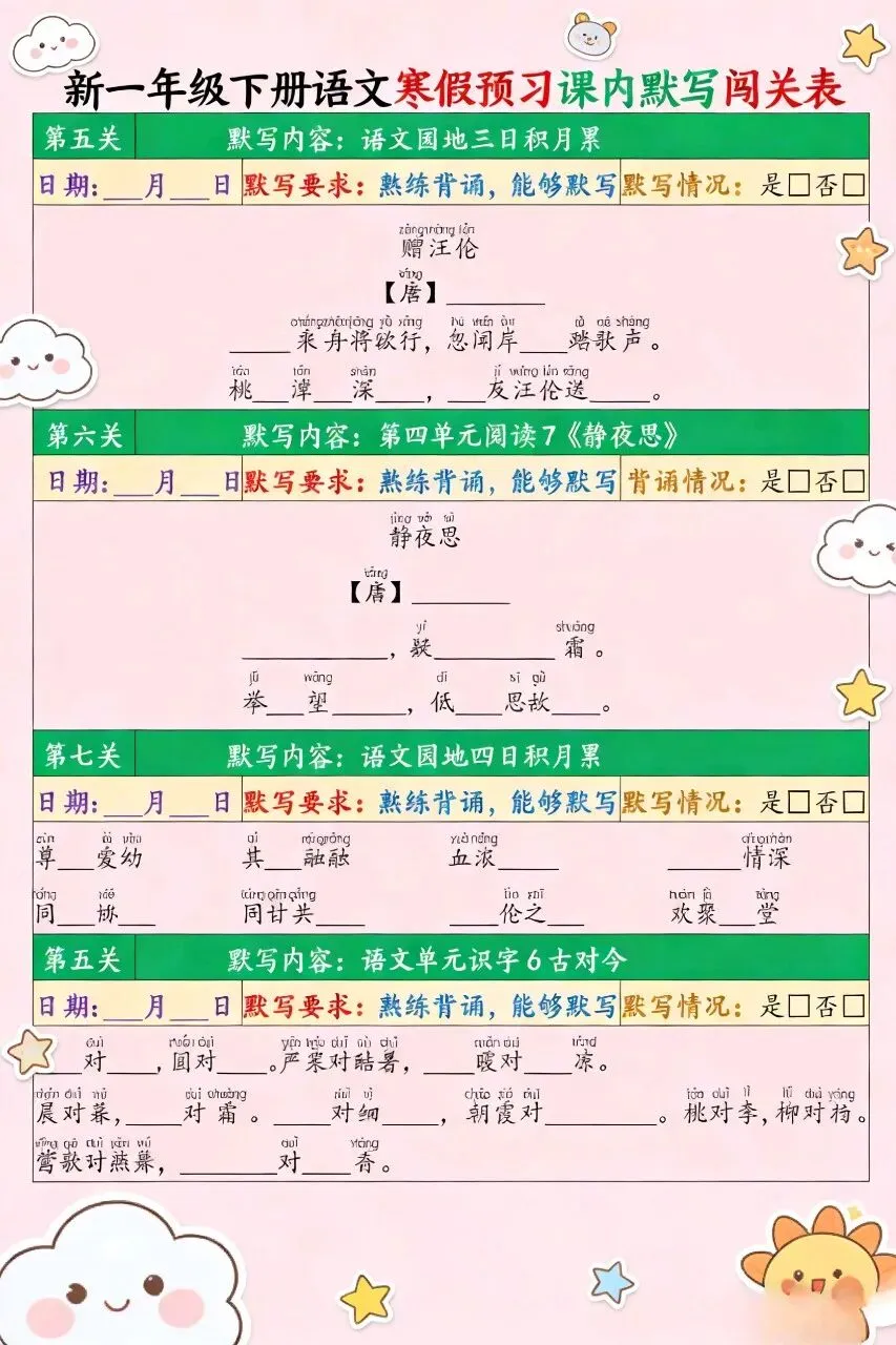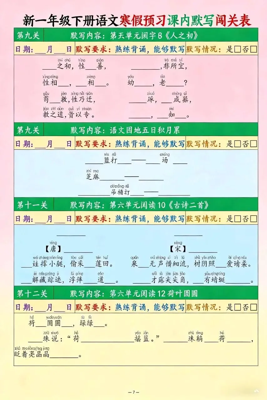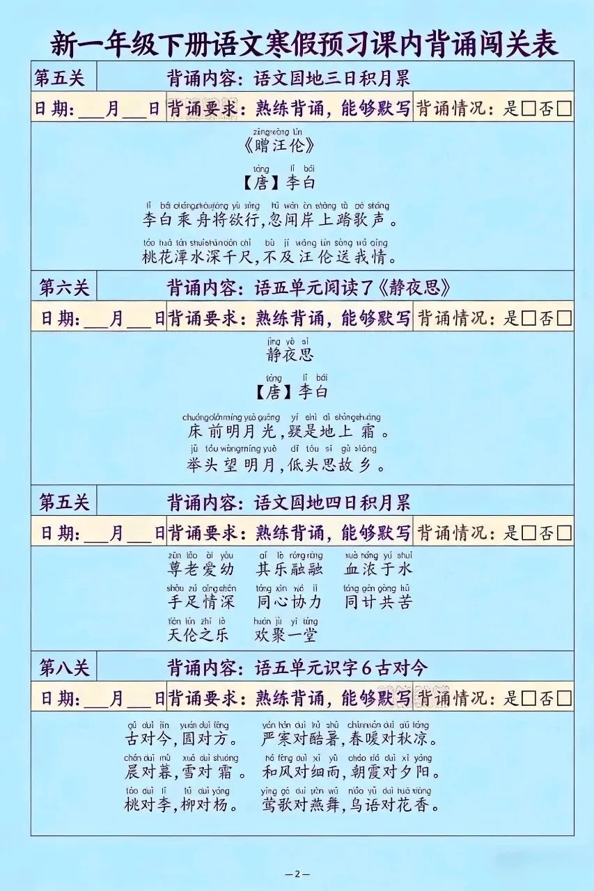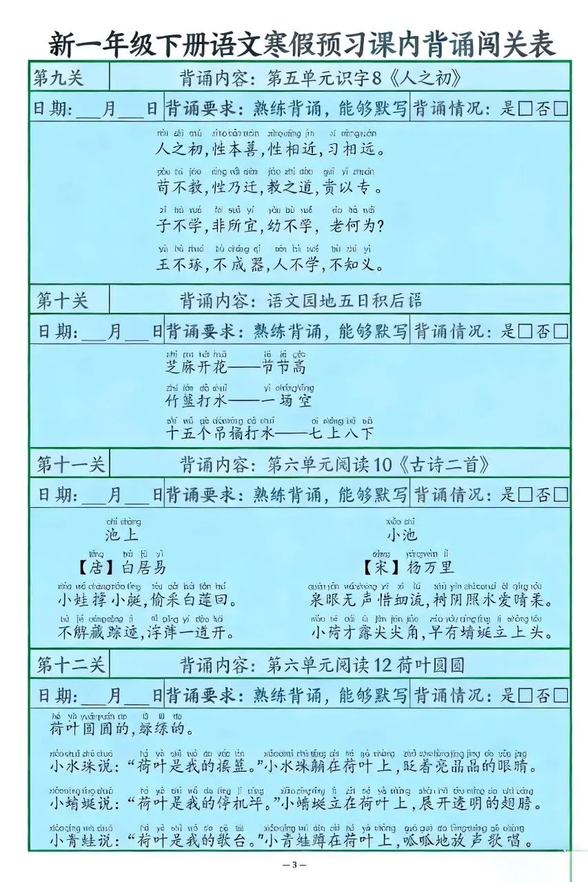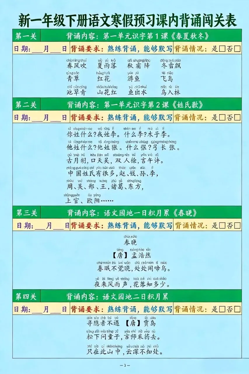 🔥 一年级娃的寒假语文救星!这套趣味闯关表把下学期必背课文拆成14关,背默结合,童趣排版,孩子主动打卡不费妈!每天10分钟,开学直接领跑全班!