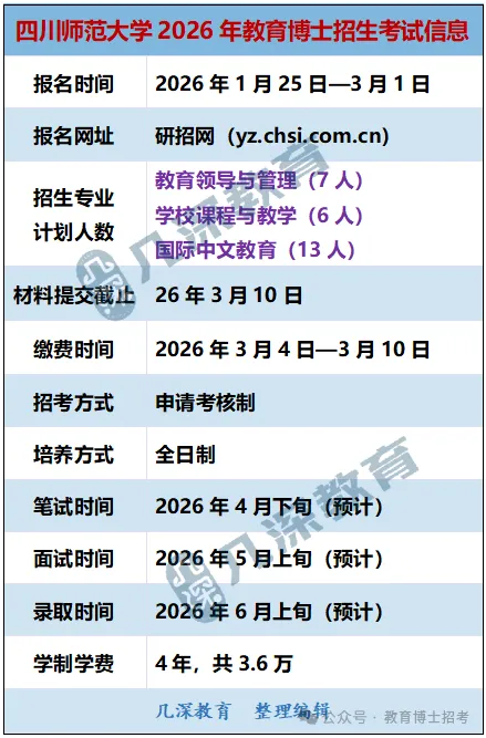 1、四川师范大学2026年博士招考分为两批次,教育博士在第二批次招生