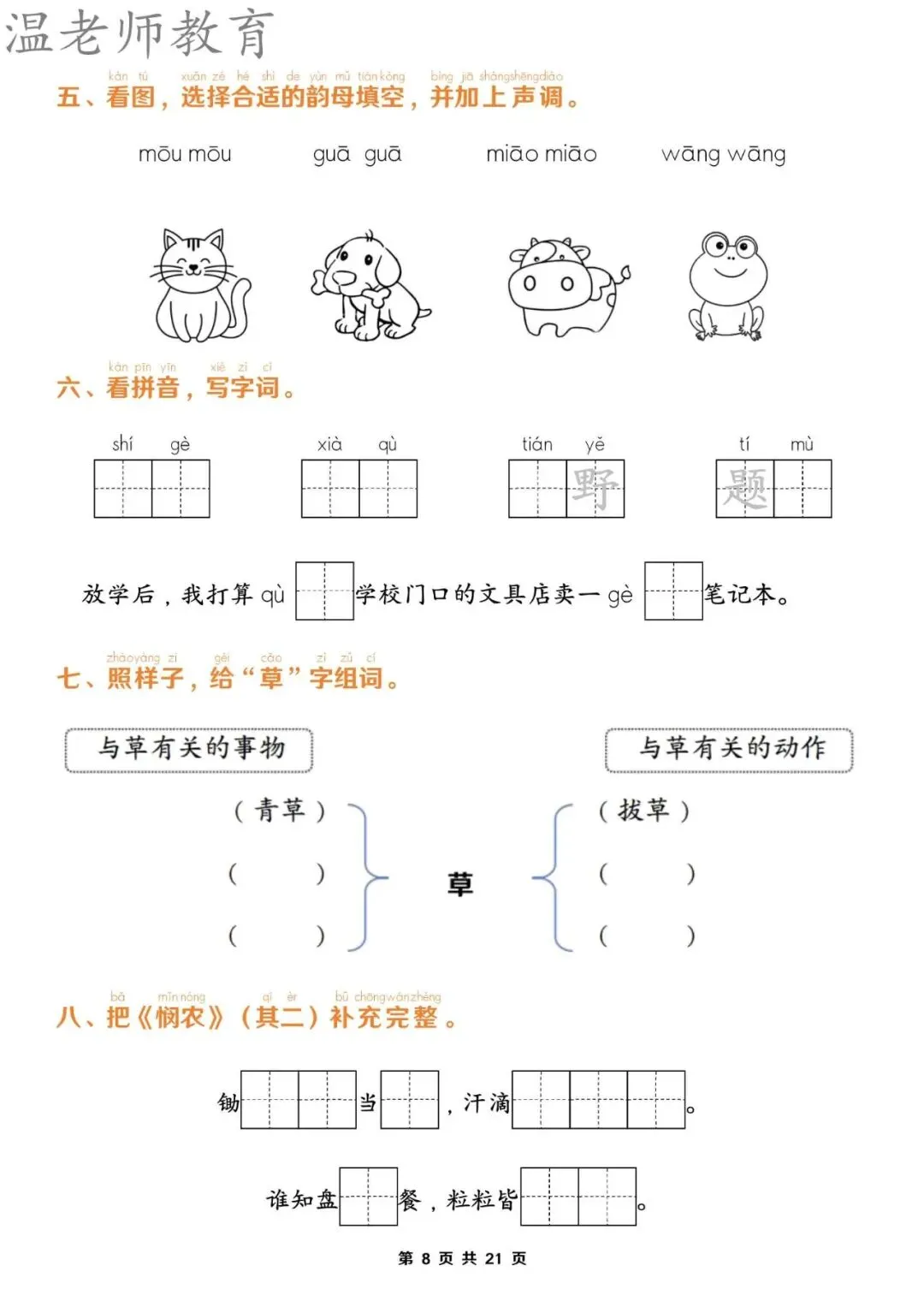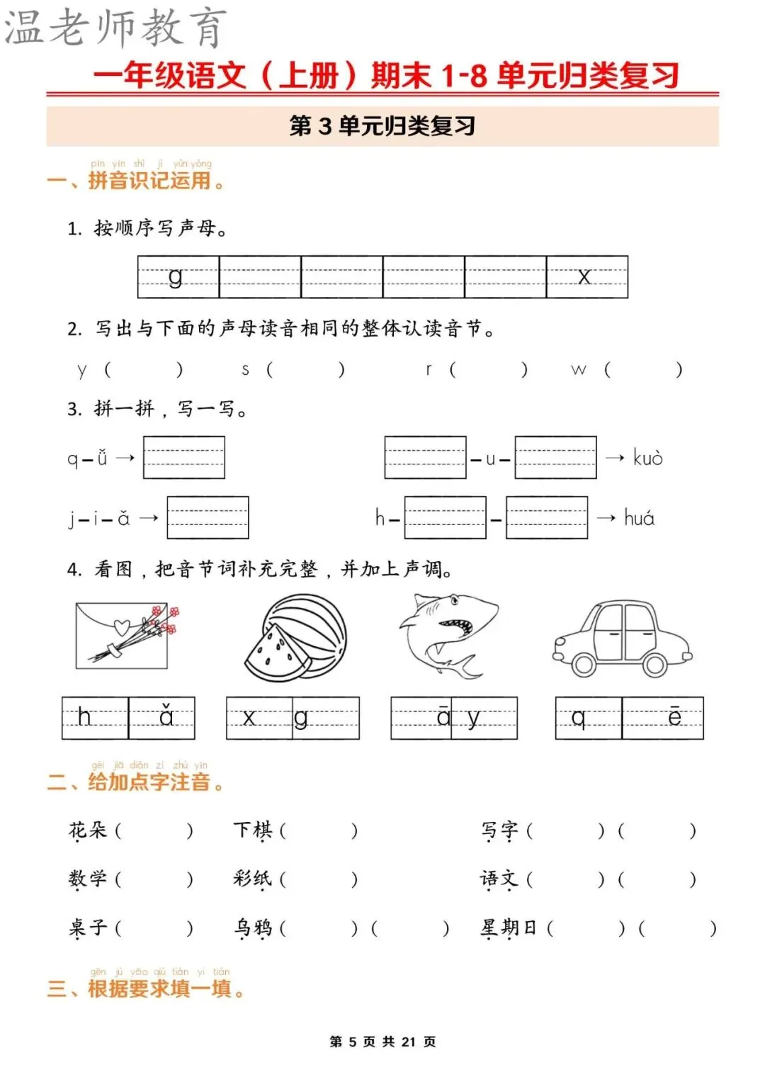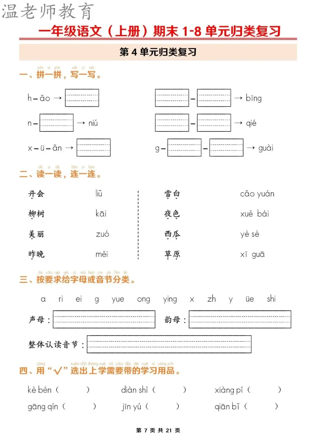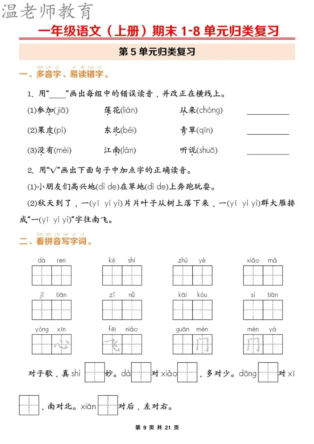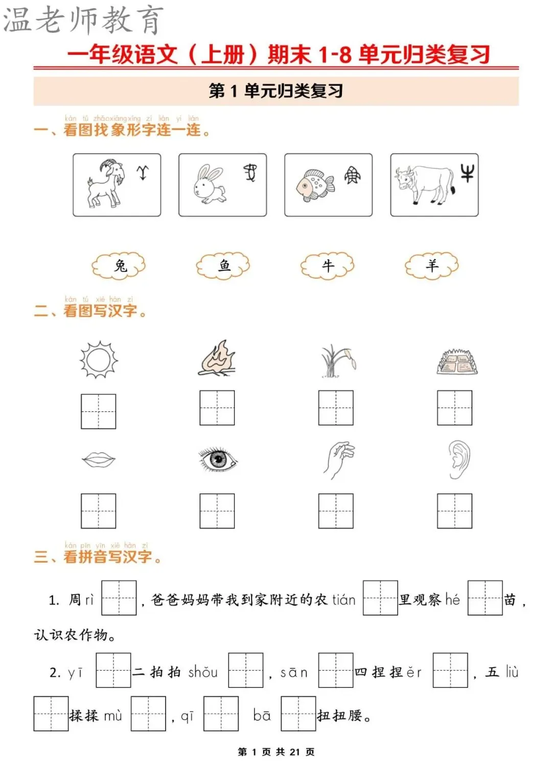 【资料整理】一年级上册语文期末1-8单元归类复习(含答案21页)